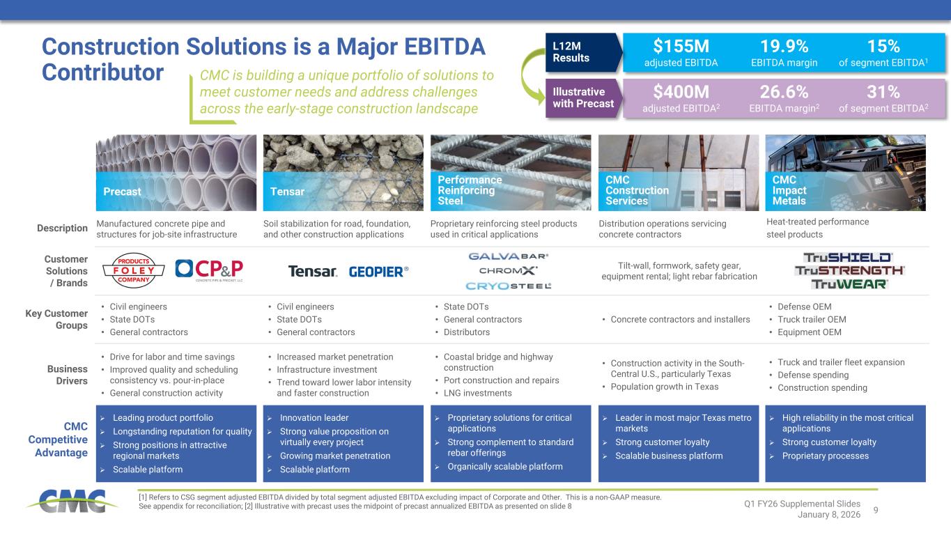8 Incremental Annualized EBITDA $240 to $250 million2 Expected Annualized Synergies by End of Year 3 Q1 FY26 Supplemental Slides January 8, 2026 [1] Based on facility count; [2] Estimated based on financial results for Foley for the 12 months ended 9/30/2025 and forecasted CY 2025 financial results for CP&P CMC’s New Precast Growth Platform Will Contribute to Q2 Results $30 to $40 million Facilities 35 States 14 Volumes ~1,750k tons2 Revenue ~$730 million2 EBITDA margin ~34%2 One of the largest precast businesses in the United States1 Industry-leading product portfolio Concentration in high-growth areas of the country Overview of CMC Precast Business Comments and Outlook • CP&P acquisition closed on December 1st; Foley acquisition closed on December 15th • Precast results will be included in CMC’s second quarter of fiscal 2026 financial reporting − Will be reflected within the Construction Solutions Group − CMC will own CP&P for the entire Q2; will own Foley for 2.5 months of the quarter • Second quarter consolidated results will include a number of acquisition-related costs, including transaction fees, debt issuance costs, and purchase accounting adjustments − These costs will be excluded from the calculation of CMC’s consolidated Core EBITDA − A portion of total acquisition and financing costs were recognized during the first quarter • Currently expect the precast business to contribute approximately $165 million to $175 million to Construction Solutions Group Adjusted EBITDA in fiscal 2026