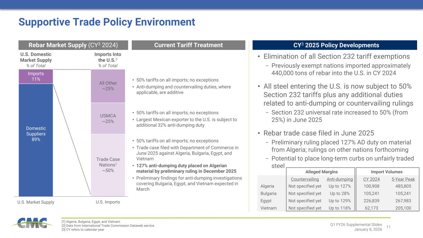 10 Manufacturing Artificial Intelligence Shipping and Logistics Energy Computing Healthcare Industrial Consumer Products Automotive Materials Healthy North American Market Conditions Q1 FY26 Supplemental Slides January 8, 2026 Note: Data in table above compares new project starts in the 11 months ended November 2025 to new project starts in the 11 months ended November 2024 [1] Source: Dodge Construction Network [2] Based on data from Whitehouse.gov Current demand on the ground is stable. Positive signals point to potential strengthening ahead. Near-Term View Mid to Long-Term View • Key internal indicators show stability in current underlying demand • Dodge Momentum Index (DMI) remains near an all-time high and was up 50% y/y in November, demonstrating a robust pipeline of future projects • New project starts within states where CMC has a large presence are outperforming national levels across several key construction segments • Structural trends should be durable, providing a major tailwind for years to come • Current presidential administration’s policies are pro-growth and designed to spur investment and facilitate execution • Nearly $3 trillion2 of corporate investment programs announced to date in CY 2025; commencement of related mega projects could be a meaningful catalyst for rebar consumption and margins $2.9T in announced investment from over 120 companies Announced Investments2 Announced Manufacturing Investments2 $1.4T in announced manufacturing investment from 85+ companies +73% +41% +9% (7%) +27% +8% +8% +3% Office (inc. data center) construction starts1 Manufacturing construction starts1 Water and Wastewater construction starts1 Highway and Street construction starts1 Key CMC States National +8% +5%Total construction starts1