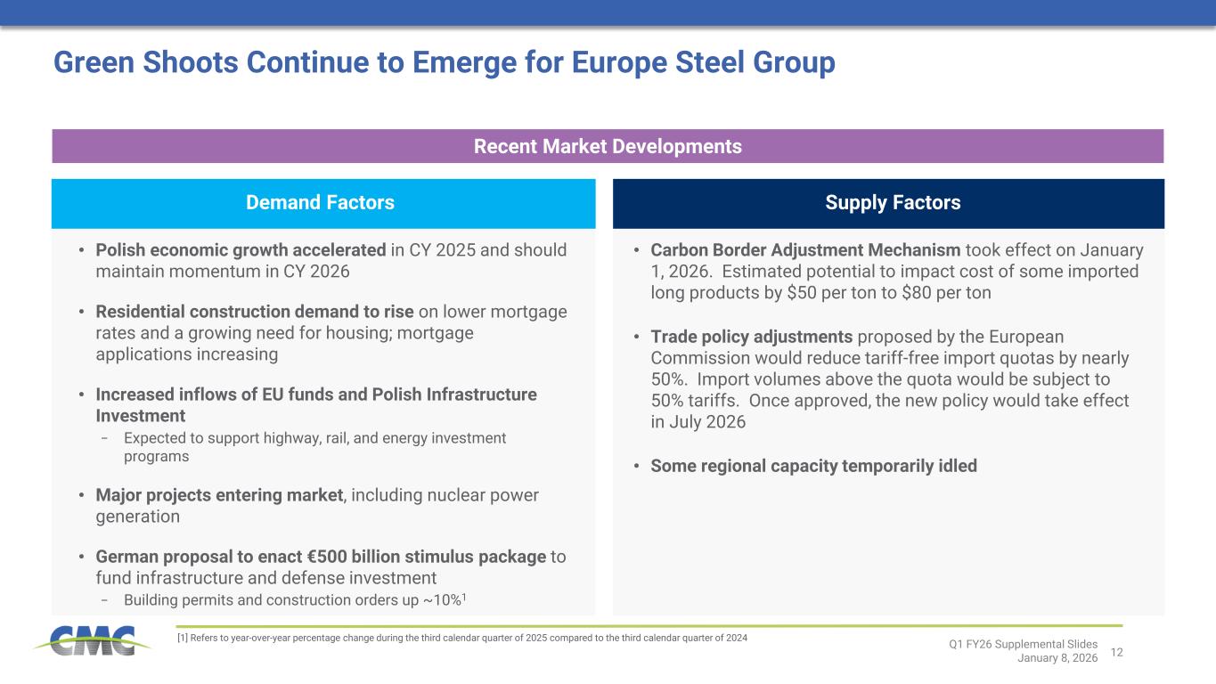 12 Q1 FY26 Supplemental Slides January 8, 2026 Demand Factors Recent Market Developments • Polish economic growth accelerated in CY 2025 and should maintain momentum in CY 2026 • Residential construction demand to rise on lower mortgage rates and a growing need for housing; mortgage applications increasing • Increased inflows of EU funds and Polish Infrastructure Investment − Expected to support highway, rail, and energy investment programs • Major projects entering market, including nuclear power generation • German proposal to enact €500 billion stimulus package to fund infrastructure and defense investment − Building permits and construction orders up ~10%1 Supply Factors • Carbon Border Adjustment Mechanism took effect on January 1, 2026. Estimated potential to impact cost of some imported long products by $50 per ton to $80 per ton • Trade policy adjustments proposed by the European Commission would reduce tariff-free import quotas by nearly 50%. Import volumes above the quota would be subject to 50% tariffs. Once approved, the new policy would take effect in July 2026 • Some regional capacity temporarily idled Green Shoots Continue to Emerge for Europe Steel Group [1] Refers to year-over-year percentage change during the third calendar quarter of 2025 compared to the third calendar quarter of 2024