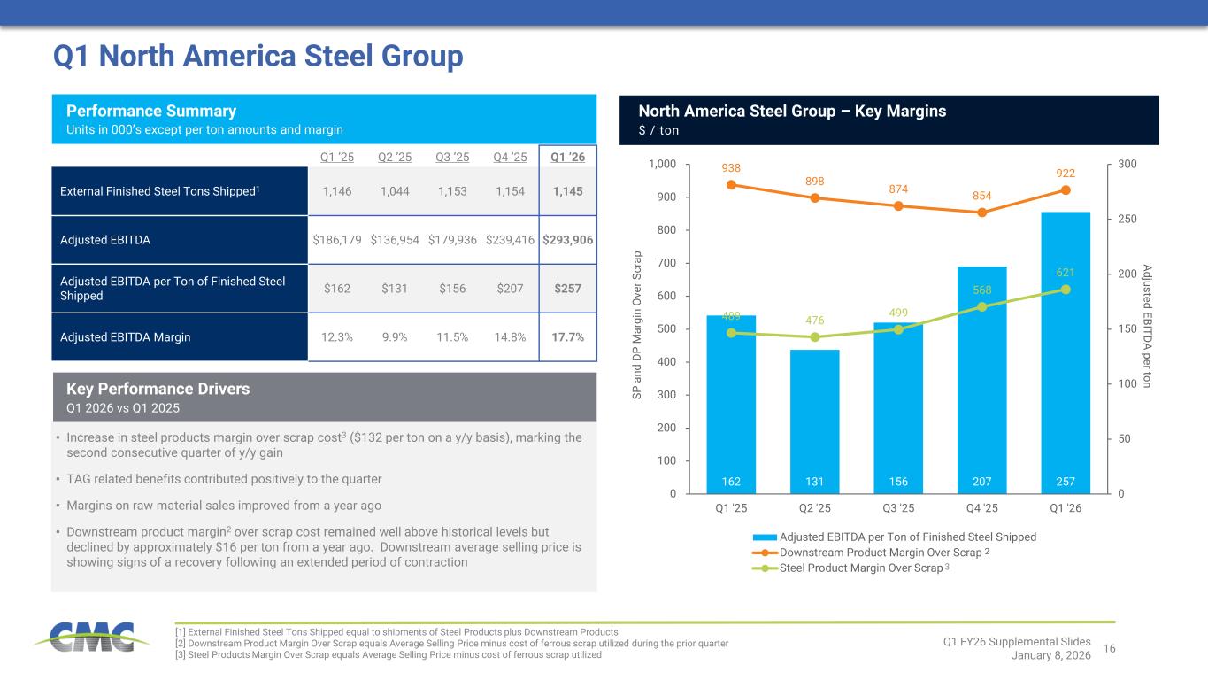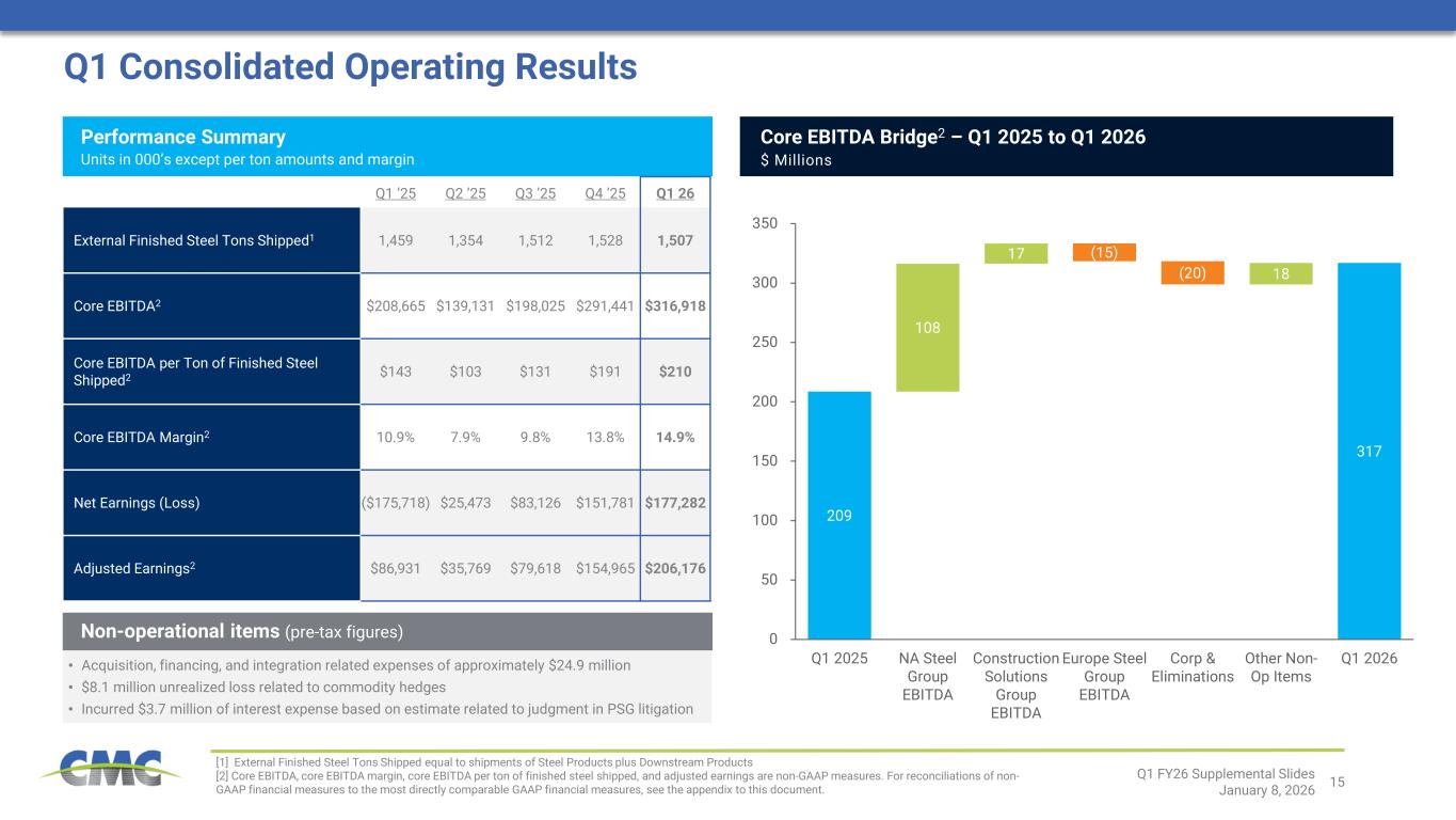 15 209 317 108 17 (15) (20) 18 0 50 100 150 200 250 300 350 Q1 2025 NA Steel Group EBITDA Construction Solutions Group EBITDA Europe Steel Group EBITDA Corp & Eliminations Other Non- Op Items Q1 2026 Q1 Consolidated Operating Results Q1 ’25 Q2 ’25 Q3 ’25 Q4 ’25 Q1 26 External Finished Steel Tons Shipped1 1,459 1,354 1,512 1,528 1,507 Core EBITDA2 $208,665 $139,131 $198,025 $291,441 $316,918 Core EBITDA per Ton of Finished Steel Shipped2 $143 $103 $131 $191 $210 Core EBITDA Margin2 10.9% 7.9% 9.8% 13.8% 14.9% Net Earnings (Loss) ($175,718) $25,473 $83,126 $151,781 $177,282 Adjusted Earnings2 $86,931 $35,769 $79,618 $154,965 $206,176 Performance Summary Units in 000’s except per ton amounts and margin • Acquisition, financing, and integration related expenses of approximately $24.9 million • $8.1 million unrealized loss related to commodity hedges • Incurred $3.7 million of interest expense based on estimate related to judgment in PSG litigation Non-operational items (pre-tax figures) [1] External Finished Steel Tons Shipped equal to shipments of Steel Products plus Downstream Products [2] Core EBITDA, core EBITDA margin, core EBITDA per ton of finished steel shipped, and adjusted earnings are non-GAAP measures. For reconciliations of non- GAAP financial measures to the most directly comparable GAAP financial measures, see the appendix to this document. Core EBITDA Bridge2 – Q1 2025 to Q1 2026 $ Millions Q1 FY26 Supplemental Slides January 8, 2026