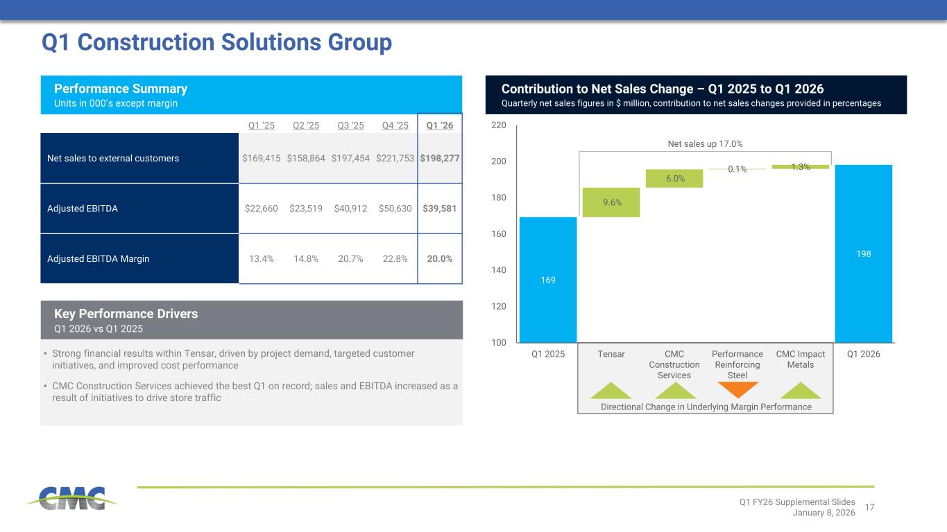 17 169 198 9.6% 6.0% 0.1% 1.3% 100 120 140 160 180 200 220 Q1 2025 Tensar CMC Construction Services Performance Reinforcing Steel CMC Impact Metals Q1 2026 Key Performance Drivers Q1 2026 vs Q1 2025 Q1 Construction Solutions Group Q1 ’25 Q2 ’25 Q3 ’25 Q4 ’25 Q1 ’26 Net sales to external customers $169,415 $158,864 $197,454 $221,753 $198,277 Adjusted EBITDA $22,660 $23,519 $40,912 $50,630 $39,581 Adjusted EBITDA Margin 13.4% 14.8% 20.7% 22.8% 20.0% Performance Summary Units in 000’s except margin • Strong financial results within Tensar, driven by project demand, targeted customer initiatives, and improved cost performance • CMC Construction Services achieved the best Q1 on record; sales and EBITDA increased as a result of initiatives to drive store traffic Contribution to Net Sales Change – Q1 2025 to Q1 2026 Quarterly net sales figures in $ million, contribution to net sales changes provided in percentages Q1 FY26 Supplemental Slides January 8, 2026 Net sales up 17.0% Directional Change in Underlying Margin Performance