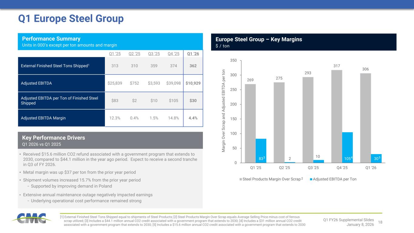 18 269 275 293 317 306 83 2 10 105 30 0 50 100 150 200 250 300 350 Q1 '25 Q2 '25 Q3 '25 Q4 '25 Q1 '26 Steel Products Margin Over Scrap Adjusted EBITDA per Ton Q1 Europe Steel Group Q1 ’25 Q2 ’25 Q3 ’25 Q4 ’25 Q1 ’26 External Finished Steel Tons Shipped1 313 310 359 374 362 Adjusted EBITDA $25,839 $752 $3,593 $39,098 $10,929 Adjusted EBITDA per Ton of Finished Steel Shipped $83 $2 $10 $105 $30 Adjusted EBITDA Margin 12.3% 0.4% 1.5% 14.8% 4.4% • Received $15.6 million CO2 refund associated with a government program that extends to 2030, compared to $44.1 million in the year ago period. Expect to receive a second tranche in Q3 of FY 2026. • Metal margin was up $37 per ton from the prior year period • Shipment volumes increased 15.7% from the prior year period − Supported by improving demand in Poland • Extensive annual maintenance outage negatively impacted earnings − Underlying operational cost performance remained strong [1] External Finished Steel Tons Shipped equal to shipments of Steel Products; [2] Steel Products Margin Over Scrap equals Average Selling Price minus cost of ferrous scrap utilized; [3] Includes a $44.1 million annual CO2 credit associated with a government program that extends to 2030; [4] Includes a $31 million annual CO2 credit associated with a government program that extends to 2030; [5] Includes a $15.6 million annual CO2 credit associated with a government program that extends to 2030 2 M ar gi n O ve r S cr ap a nd A dj us te d EB IT DA p er to n Q1 FY26 Supplemental Slides January 8, 2026 Performance Summary Units in 000’s except per ton amounts and margin Key Performance Drivers Q1 2026 vs Q1 2025 Europe Steel Group – Key Margins $ / ton 3 4 5