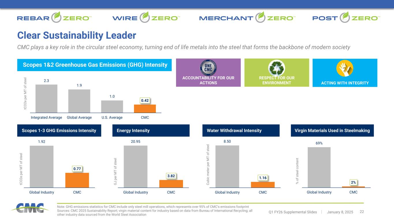 22 2.3 1.9 1.0 0.42 Integrated Average Global Average U.S. Average CMC 1.16 8.50 CMCGlobal Industry 3.82 20.95 CMCGlobal Industry 0.77 1.92 CMCGlobal Industry Q1 FY26 Supplemental Slides │ January 8, 2025 Note: GHG emissions statistics for CMC include only steel mill operations, which represents over 95% of CMC’s emissions footprint Sources: CMC 2025 Sustainability Report; virgin material content for industry based on data from Bureau of International Recycling; all other industry data sourced from the World Steel Association Clear Sustainability Leader CMC plays a key role in the circular steel economy, turning end of life metals into the steel that forms the backbone of modern society Scopes 1&2 Greenhouse Gas Emissions (GHG) Intensity ACCOUNTABILITY FOR OUR ACTIONS RESPECT FOR OUR ENVIRONMENT ACTING WITH INTEGRITY tC O 2e p er M T of s te el Energy Intensity G J pe r M T of s te el Water Withdrawal Intensity Cu bi c m et er p er M T of s te el 2% 69% CMCGlobal Industry % o f s te el c on te nt Scopes 1-3 GHG Emissions Intensity tC O 2e p er M T of s te el Virgin Materials Used in Steelmaking