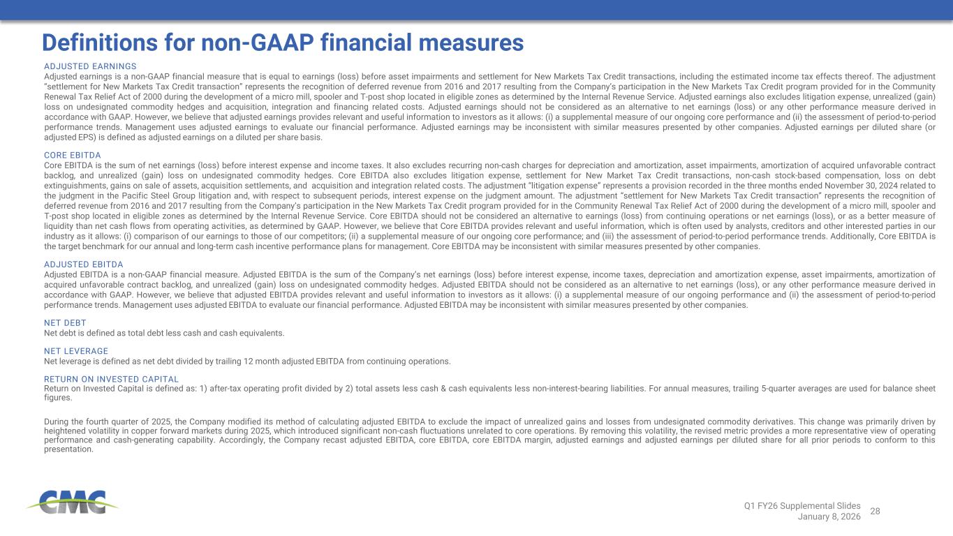 28 ADJUSTED EARNINGS Adjusted earnings is a non-GAAP financial measure that is equal to earnings (loss) before asset impairments and settlement for New Markets Tax Credit transactions, including the estimated income tax effects thereof. The adjustment “settlement for New Markets Tax Credit transaction” represents the recognition of deferred revenue from 2016 and 2017 resulting from the Company’s participation in the New Markets Tax Credit program provided for in the Community Renewal Tax Relief Act of 2000 during the development of a micro mill, spooler and T-post shop located in eligible zones as determined by the Internal Revenue Service. Adjusted earnings also excludes litigation expense, unrealized (gain) loss on undesignated commodity hedges and acquisition, integration and financing related costs. Adjusted earnings should not be considered as an alternative to net earnings (loss) or any other performance measure derived in accordance with GAAP. However, we believe that adjusted earnings provides relevant and useful information to investors as it allows: (i) a supplemental measure of our ongoing core performance and (ii) the assessment of period-to-period performance trends. Management uses adjusted earnings to evaluate our financial performance. Adjusted earnings may be inconsistent with similar measures presented by other companies. Adjusted earnings per diluted share (or adjusted EPS) is defined as adjusted earnings on a diluted per share basis. CORE EBITDA Core EBITDA is the sum of net earnings (loss) before interest expense and income taxes. It also excludes recurring non-cash charges for depreciation and amortization, asset impairments, amortization of acquired unfavorable contract backlog, and unrealized (gain) loss on undesignated commodity hedges. Core EBITDA also excludes litigation expense, settlement for New Market Tax Credit transactions, non-cash stock-based compensation, loss on debt extinguishments, gains on sale of assets, acquisition settlements, and acquisition and integration related costs. The adjustment “litigation expense” represents a provision recorded in the three months ended November 30, 2024 related to the judgment in the Pacific Steel Group litigation and, with respect to subsequent periods, interest expense on the judgment amount. The adjustment “settlement for New Markets Tax Credit transaction” represents the recognition of deferred revenue from 2016 and 2017 resulting from the Company’s participation in the New Markets Tax Credit program provided for in the Community Renewal Tax Relief Act of 2000 during the development of a micro mill, spooler and T-post shop located in eligible zones as determined by the Internal Revenue Service. Core EBITDA should not be considered an alternative to earnings (loss) from continuing operations or net earnings (loss), or as a better measure of liquidity than net cash flows from operating activities, as determined by GAAP. However, we believe that Core EBITDA provides relevant and useful information, which is often used by analysts, creditors and other interested parties in our industry as it allows: (i) comparison of our earnings to those of our competitors; (ii) a supplemental measure of our ongoing core performance; and (iii) the assessment of period-to-period performance trends. Additionally, Core EBITDA is the target benchmark for our annual and long-term cash incentive performance plans for management. Core EBITDA may be inconsistent with similar measures presented by other companies. ADJUSTED EBITDA Adjusted EBITDA is a non-GAAP financial measure. Adjusted EBITDA is the sum of the Company’s net earnings (loss) before interest expense, income taxes, depreciation and amortization expense, asset impairments, amortization of acquired unfavorable contract backlog, and unrealized (gain) loss on undesignated commodity hedges. Adjusted EBITDA should not be considered as an alternative to net earnings (loss), or any other performance measure derived in accordance with GAAP. However, we believe that adjusted EBITDA provides relevant and useful information to investors as it allows: (i) a supplemental measure of our ongoing performance and (ii) the assessment of period-to-period performance trends. Management uses adjusted EBITDA to evaluate our financial performance. Adjusted EBITDA may be inconsistent with similar measures presented by other companies. NET DEBT Net debt is defined as total debt less cash and cash equivalents. NET LEVERAGE Net leverage is defined as net debt divided by trailing 12 month adjusted EBITDA from continuing operations. RETURN ON INVESTED CAPITAL Return on Invested Capital is defined as: 1) after-tax operating profit divided by 2) total assets less cash & cash equivalents less non-interest-bearing liabilities. For annual measures, trailing 5-quarter averages are used for balance sheet figures. During the fourth quarter of 2025, the Company modified its method of calculating adjusted EBITDA to exclude the impact of unrealized gains and losses from undesignated commodity derivatives. This change was primarily driven by heightened volatility in copper forward markets during 2025, which introduced significant non-cash fluctuations unrelated to core operations. By removing this volatility, the revised metric provides a more representative view of operating performance and cash-generating capability. Accordingly, the Company recast adjusted EBITDA, core EBITDA, core EBITDA margin, adjusted earnings and adjusted earnings per diluted share for all prior periods to conform to this presentation. Q1 FY26 Supplemental Slides January 8, 2026 Definitions for non-GAAP financial measures