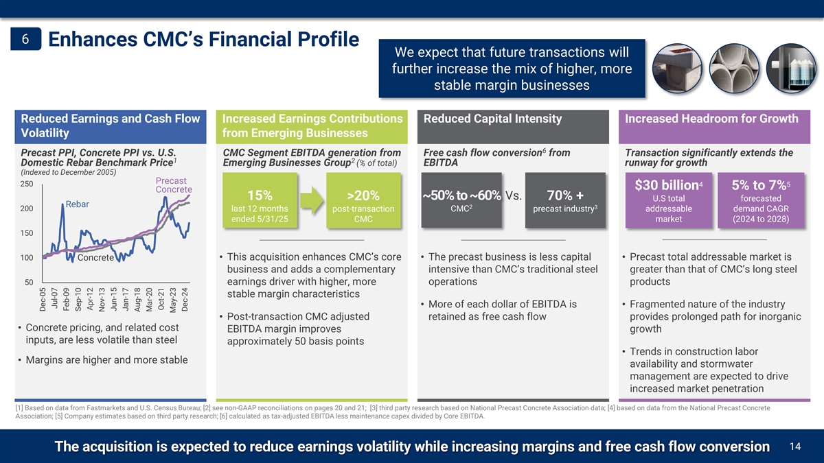 6 Enhances CMC’s Financial Profile We expect that future transactions will further increase the mix of higher, more stable margin businesses Reduced Earnings and Cash Flow Increased Earnings Contributions Reduced Capital Intensity Increased Headroom for Growth Volatility from Emerging Businesses 6 Precast PPI, Concrete PPI vs. U.S. CMC Segment EBITDA generation from Free cash flow conversion from Transaction significantly extends the 1 2 Domestic Rebar Benchmark Price Emerging Businesses Group (% of total) EBITDA runway for growth (Indexed to December 2005) Precast 250 4 5 $30 billion 5% to 7% Concrete 15% ~50% to ~60% Vs. >20% 70% + U.S total forecasted Rebar 2 3 200 last 12 months post-transaction CMC precast industry addressable demand CAGR ended 5/31/25 CMC market (2024 to 2028) 150 100 Concrete • This acquisition enhances CMC’s core • The precast business is less capital • Precast total addressable market is business and adds a complementary intensive than CMC’s traditional steel greater than that of CMC’s long steel 50 earnings driver with higher, more operations products stable margin characteristics • More of each dollar of EBITDA is • Fragmented nature of the industry • Post-transaction CMC adjusted retained as free cash flow provides prolonged path for inorganic • Concrete pricing, and related cost EBITDA margin improves growth inputs, are less volatile than steel approximately 50 basis points • Trends in construction labor • Margins are higher and more stable availability and stormwater management are expected to drive increased market penetration [1] Based on data from Fastmarkets and U.S. Census Bureau; [2] see non-GAAP reconciliations on pages 20 and 21; [3] third party research based on National Precast Concrete Association data; [4] based on data from the National Precast Concrete Association; [5] Company estimates based on third party research; [6] calculated as tax-adjusted EBITDA less maintenance capex divided by Core EBITDA. 14 CMC Acquires X 14 The acquisition is expected to reduce earnings volatility while increasing margins and free cash flow conversion Dec-05 Jul-07 Feb-09 Sep-10 Apr-12 Nov-13 Jun-15 Jan-17 Aug-18 Mar-20 Oct-21 May-23 Dec-24