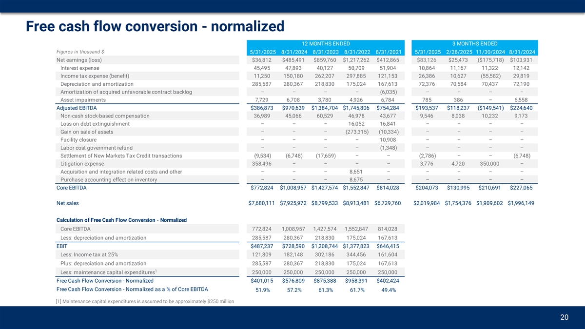 Free cash flow conversion - normalized 12 MONTHS ENDED 3 MONTHS ENDED Figures in thousand $ 5/31/2025 8/31/2024 8/31/2023 8/31/2022 8/31/2021 5/31/2025 2/28/2025 11/30/2024 8/31/2024 Net earnings (loss) $36,812 $485,491 $859,760 $1,217,262 $412,865 $83,126 $25,473 ($175,718) $103,931 Interest expense 45,495 47,893 40,127 50,709 51,904 10,864 11,167 11,322 12,142 Income tax expense (benefit) 11,250 150,180 262,207 297,885 121,153 26,386 10,627 (55,582) 29,819 Depreciation and amortization 285,587 280,367 218,830 175,024 167,613 72,376 70,584 70,437 72,190 Amortization of acquired unfavorable contract backlog – – – – (6,035) – – – – Asset impairments 7,729 6,708 3,780 4,926 6,784 785 386 – 6,558 Adjusted EBITDA $386,873 $970,639 $1,384,704 $1,745,806 $754,284 $193,537 $118,237 ($149,541) $224,640 Non-cash stock-based compensation 36,989 45,066 60,529 46,978 43,677 9,546 8,038 10,232 9,173 Loss on debt extinguishment – – – 16,052 16,841 – – – – Gain on sale of assets – – – (273,315) (10,334) – – – – Facility closure – – – – 10,908 – – – – Labor cost government refund – – – – (1,348) – – – – Settlement of New Markets Tax Credit transactions (9,534) (6,748) (17,659) – – (2,786) – – (6,748) Litigation expense 358,496 – – – – 3,776 4,720 350,000 – Acquisition and integration related costs and other – – – 8,651 – – – – – Purchase accounting effect on inventory – – – 8,675 – – – – – Core EBITDA $772,824 $1,008,957 $1,427,574 $1,552,847 $814,028 $204,073 $130,995 $210,691 $227,065 Net sales $7,680,111 $7,925,972 $8,799,533 $8,913,481 $6,729,760 $2,019,984 $1,754,376 $1,909,602 $1,996,149 Calculation of Free Cash Flow Conversion - Normalized Core EBITDA 772,824 1,008,957 1,427,574 1,552,847 814,028 Less: depreciation and amortization 285,587 280,367 218,830 175,024 167,613 EBIT $487,237 $728,590 $1,208,744 $1,377,823 $646,415 Less: Income tax at 25% 121,809 182,148 302,186 344,456 161,604 Plus: depreciation and amortization 285,587 280,367 218,830 175,024 167,613 1 Less: maintenance capital expenditures 250,000 250,000 250,000 250,000 250,000 Free Cash Flow Conversion - Normalized $401,015 $576,809 $875,388 $958,391 $402,424 Free Cash Flow Conversion - Normalized as a % of Core EBITDA 51.9% 57.2% 61.3% 61.7% 49.4% [1] Maintenance capital expenditures is assumed to be approximately $250 million 20