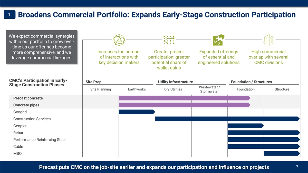 1 Broadens Commercial Portfolio: Expands Early-Stage Construction Participation We expect commercial synergies within our portfolio to grow over- time as our offerings become Increases the number Greater project Expanded offerings High commercial more comprehensive, and we of interactions with participation; greater of essential and overlap with several leverage commercial linkages key decision makers potential share of engineered solutions CMC divisions wallet gains CMC’s Participation in Early- Site Prep Utility Infrastructure Foundation / Structures Stage Construction Phases Wastewater / Site Planning Earthworks Dry Utilities Foundation Structure Stormwater Precast concrete Concrete pipes Geogrid Construction Services Geopier Rebar Performance Reinforcing Steel Cable MBQ CMC Acquires X 7 Precast puts CMC on the job-site earlier and expands our participation and influence on projects