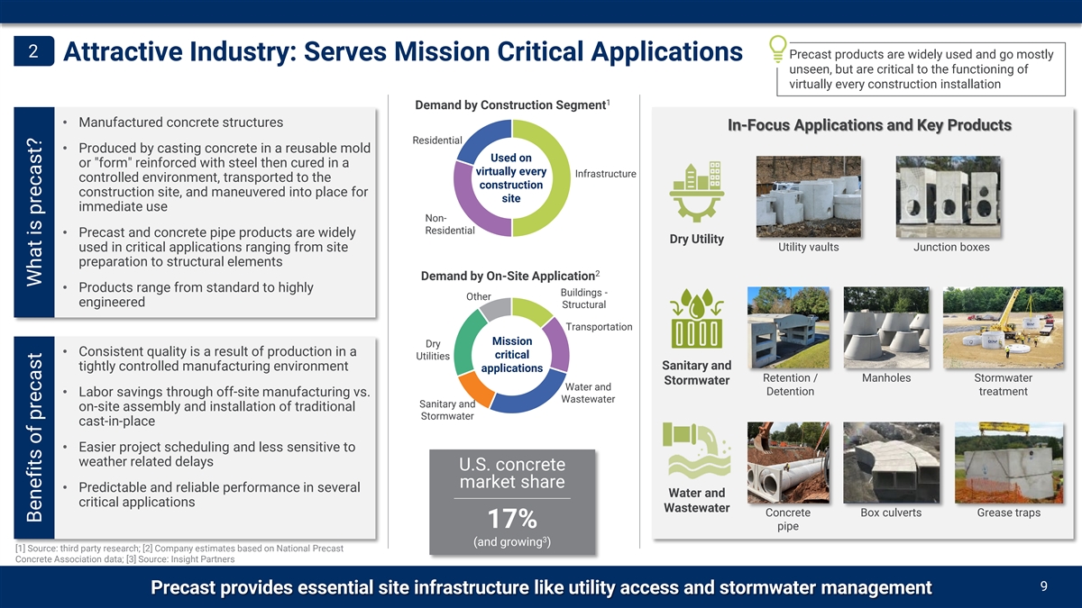 2 Precast products are widely used and go mostly Attractive Industry: Serves Mission Critical Applications unseen, but are critical to the functioning of virtually every construction installation 1 Demand by Construction Segment • Manufactured concrete structures In-Focus Applications and Key Products Residential • Produced by casting concrete in a reusable mold Used on or form reinforced with steel then cured in a virtually every Infrastructure controlled environment, transported to the construction construction site, and maneuvered into place for site immediate use Non- Residential • Precast and concrete pipe products are widely Dry Utility Utility vaults Junction boxes used in critical applications ranging from site preparation to structural elements 2 Demand by On-Site Application • Products range from standard to highly Buildings - Other engineered Structural Transportation Mission Dry • Consistent quality is a result of production in a Utilities critical Sanitary and tightly controlled manufacturing environment applications Retention / Manholes Stormwater Stormwater Water and Detention treatment • Labor savings through off-site manufacturing vs. Wastewater Sanitary and on-site assembly and installation of traditional Stormwater cast-in-place • Easier project scheduling and less sensitive to weather related delays U.S. concrete market share • Predictable and reliable performance in several Water and critical applications Wastewater Concrete Box culverts Grease traps 17% pipe 3 (and growing ) [1] Source: third party research; [2] Company estimates based on National Precast Concrete Association data; [3] Source: Insight Partners CMC Acquires X 9 Precast provides essential site infrastructure like utility access and stormwater management Benefits of precast What is precast?