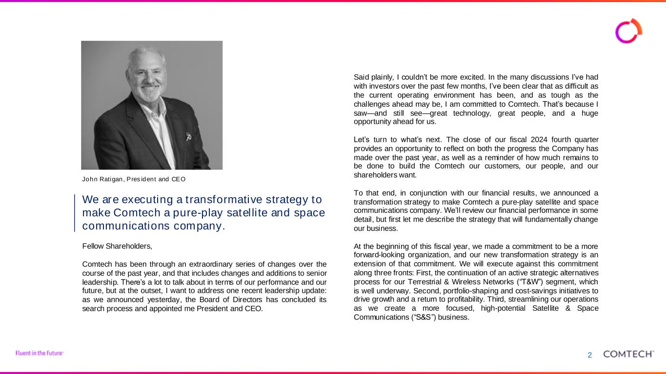 Said plainly, I couldn’t be more excited. In the many discussions I’ve had with investors over the past few months, I’ve been clear that as difficult as the current operating environment has been, and as tough as the challenges ahead may be, I am committed to Comtech. That’s because I saw—and still see—great technology, great people, and a huge opportunity ahead for us. Let’s turn to what’s next. The close of our fiscal 2024 fourth quarter provides an opportunity to reflect on both the progress the Company has made over the past year, as well as a reminder of how much remains to be done to build the Comtech our customers, our people, and our shareholders want. To that end, in conjunction with our financial results, we announced a transformation strategy to make Comtech a pure-play satellite and space communications company. We’ll review our financial performance in some detail, but first let me describe the strategy that will fundamentally change our business. At the beginning of this fiscal year, we made a commitment to be a more forward-looking organization, and our new transformation strategy is an extension of that commitment. We will execute against this commitment along three fronts: First, the continuation of an active strategic alternatives process for our Terrestrial & Wireless Networks (“T&W”) segment, which is well underway. Second, portfolio-shaping and cost-savings initiatives to drive growth and a return to profitability. Third, streamlining our operations as we create a more focused, high-potential Satellite & Space Communications (“S&S”) business. John Ratigan, President and CEO We are executing a transformative strategy to make Comtech a pure-play satellite and space communications company. 2 Fellow Shareholders, Comtech has been through an extraordinary series of changes over the course of the past year, and that includes changes and additions to senior leadership. There’s a lot to talk about in terms of our performance and our future, but at the outset, I want to address one recent leadership update: as we announced yesterday, the Board of Directors has concluded its search process and appointed me President and CEO.