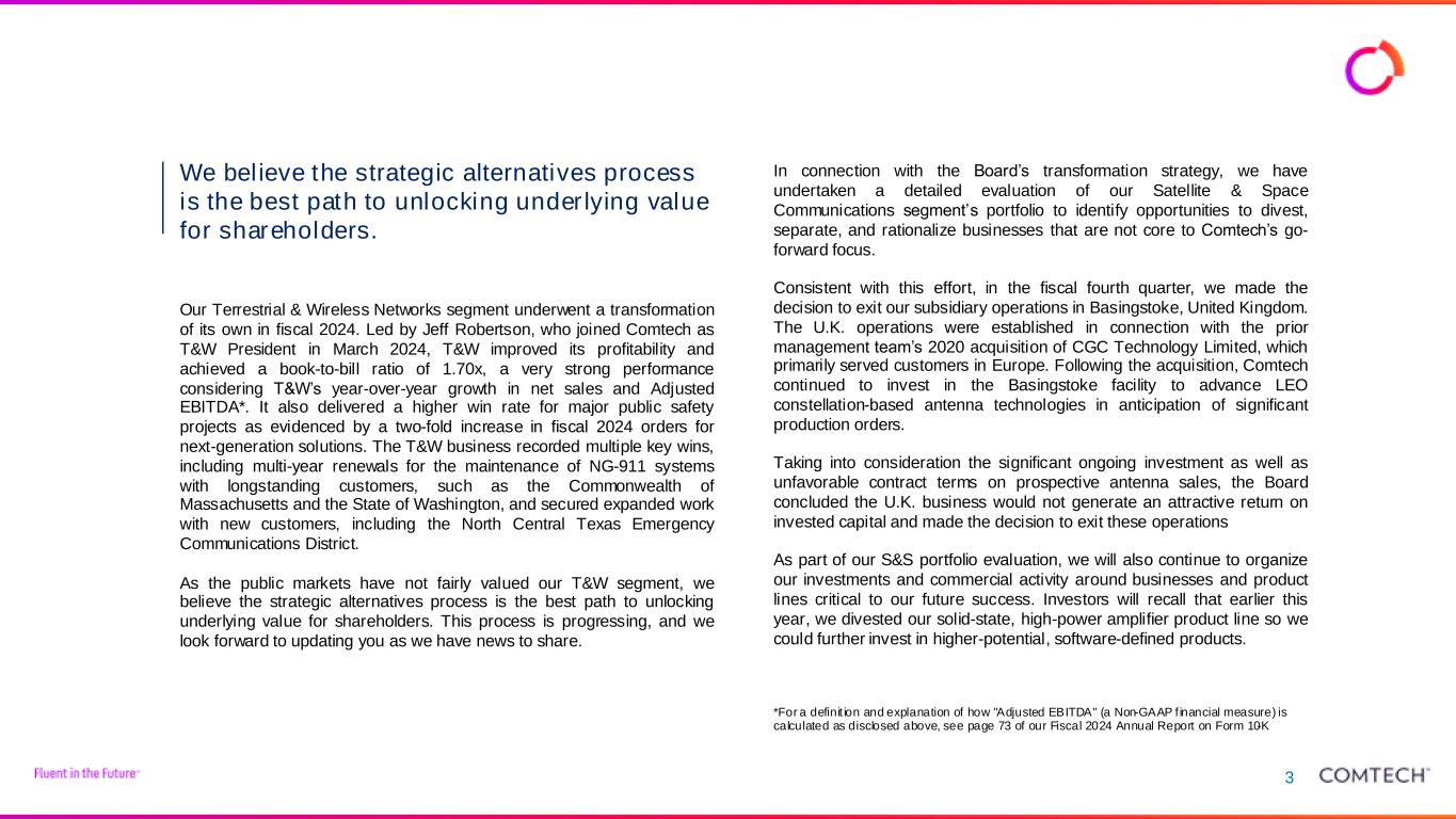 Our Terrestrial & Wireless Networks segment underwent a transformation of its own in fiscal 2024. Led by Jeff Robertson, who joined Comtech as T&W President in March 2024, T&W improved its profitability and achieved a book-to-bill ratio of 1.70x, a very strong performance considering T&W’s year-over-year growth in net sales and Adjusted EBITDA*. It also delivered a higher win rate for major public safety projects as evidenced by a two-fold increase in fiscal 2024 orders for next-generation solutions. The T&W business recorded multiple key wins, including multi-year renewals for the maintenance of NG-911 systems with longstanding customers, such as the Commonwealth of Massachusetts and the State of Washington, and secured expanded work with new customers, including the North Central Texas Emergency Communications District. As the public markets have not fairly valued our T&W segment, we believe the strategic alternatives process is the best path to unlocking underlying value for shareholders. This process is progressing, and we look forward to updating you as we have news to share. In connection with the Board’s transformation strategy, we have undertaken a detailed evaluation of our Satellite & Space Communications segment’s portfolio to identify opportunities to divest, separate, and rationalize businesses that are not core to Comtech’s go- forward focus. Consistent with this effort, in the fiscal fourth quarter, we made the decision to exit our subsidiary operations in Basingstoke, United Kingdom. The U.K. operations were established in connection with the prior management team’s 2020 acquisition of CGC Technology Limited, which primarily served customers in Europe. Following the acquisition, Comtech continued to invest in the Basingstoke facility to advance LEO constellation-based antenna technologies in anticipation of significant production orders. Taking into consideration the significant ongoing investment as well as unfavorable contract terms on prospective antenna sales, the Board concluded the U.K. business would not generate an attractive return on invested capital and made the decision to exit these operations As part of our S&S portfolio evaluation, we will also continue to organize our investments and commercial activity around businesses and product lines critical to our future success. Investors will recall that earlier this year, we divested our solid-state, high-power amplifier product line so we could further invest in higher-potential, software-defined products. 3 We believe the strategic alternatives process is the best path to unlocking underlying value for shareholders. *For a definit ion and explanation of how "Adjusted EBITDA" (a Non-GAAP f inancial measure) is calculated as disclosed above, see page 73 of our Fiscal 2024 Annual Report on Form 10-K