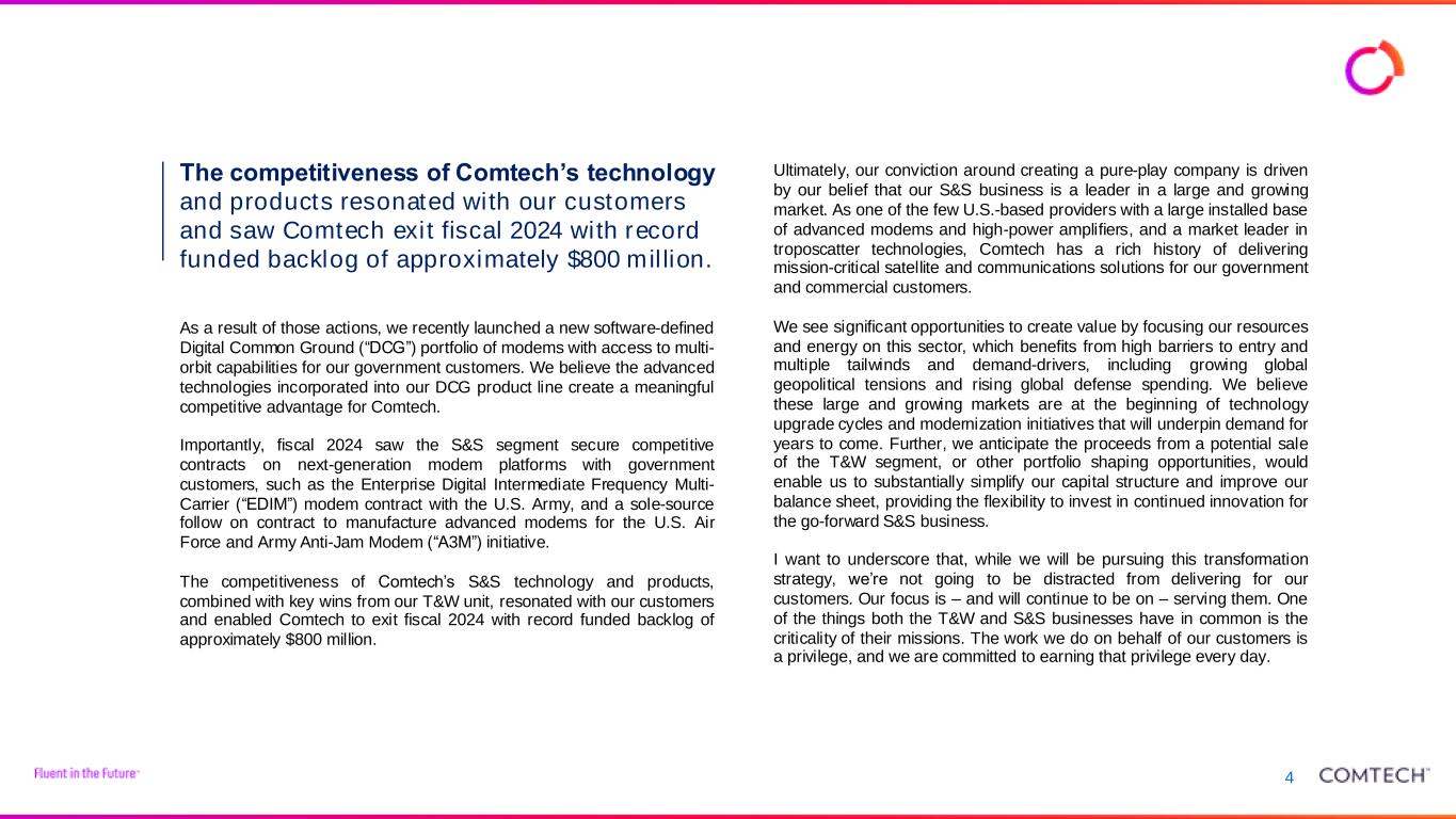 As a result of those actions, we recently launched a new software-defined Digital Common Ground (“DCG”) portfolio of modems with access to multi- orbit capabilities for our government customers. We believe the advanced technologies incorporated into our DCG product line create a meaningful competitive advantage for Comtech. Importantly, fiscal 2024 saw the S&S segment secure competitive contracts on next-generation modem platforms with government customers, such as the Enterprise Digital Intermediate Frequency Multi- Carrier (“EDIM”) modem contract with the U.S. Army, and a sole-source follow on contract to manufacture advanced modems for the U.S. Air Force and Army Anti-Jam Modem (“A3M”) initiative. The competitiveness of Comtech’s S&S technology and products, combined with key wins from our T&W unit, resonated with our customers and enabled Comtech to exit fiscal 2024 with record funded backlog of approximately $800 million. Ultimately, our conviction around creating a pure-play company is driven by our belief that our S&S business is a leader in a large and growing market. As one of the few U.S.-based providers with a large installed base of advanced modems and high-power amplifiers, and a market leader in troposcatter technologies, Comtech has a rich history of delivering mission-critical satellite and communications solutions for our government and commercial customers. We see significant opportunities to create value by focusing our resources and energy on this sector, which benefits from high barriers to entry and multiple tailwinds and demand-drivers, including growing global geopolitical tensions and rising global defense spending. We believe these large and growing markets are at the beginning of technology upgrade cycles and modernization initiatives that will underpin demand for years to come. Further, we anticipate the proceeds from a potential sale of the T&W segment, or other portfolio shaping opportunities, would enable us to substantially simplify our capital structure and improve our balance sheet, providing the flexibility to invest in continued innovation for the go-forward S&S business. I want to underscore that, while we will be pursuing this transformation strategy, we’re not going to be distracted from delivering for our customers. Our focus is – and will continue to be on – serving them. One of the things both the T&W and S&S businesses have in common is the criticality of their missions. The work we do on behalf of our customers is a privilege, and we are committed to earning that privilege every day. 4 The competitiveness of Comtech’s technology and products resonated with our customers and saw Comtech exit fiscal 2024 with record funded backlog of approximately $800 million.