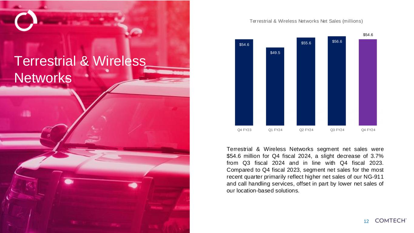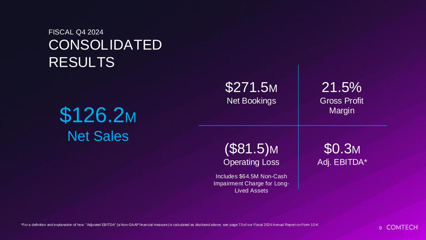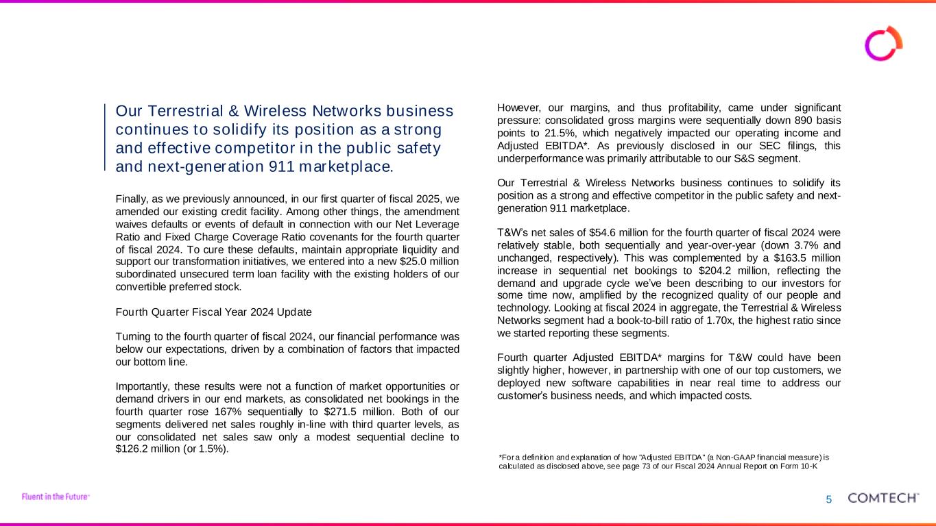 Finally, as we previously announced, in our first quarter of fiscal 2025, we amended our existing credit facility. Among other things, the amendment waives defaults or events of default in connection with our Net Leverage Ratio and Fixed Charge Coverage Ratio covenants for the fourth quarter of fiscal 2024. To cure these defaults, maintain appropriate liquidity and support our transformation initiatives, we entered into a new $25.0 million subordinated unsecured term loan facility with the existing holders of our convertible preferred stock. Fourth Quarter Fiscal Year 2024 Update Turning to the fourth quarter of fiscal 2024, our financial performance was below our expectations, driven by a combination of factors that impacted our bottom line. Importantly, these results were not a function of market opportunities or demand drivers in our end markets, as consolidated net bookings in the fourth quarter rose 167% sequentially to $271.5 million. Both of our segments delivered net sales roughly in-line with third quarter levels, as our consolidated net sales saw only a modest sequential decline to $126.2 million (or 1.5%). However, our margins, and thus profitability, came under significant pressure: consolidated gross margins were sequentially down 890 basis points to 21.5%, which negatively impacted our operating income and Adjusted EBITDA*. As previously disclosed in our SEC filings, this underperformance was primarily attributable to our S&S segment. Our Terrestrial & Wireless Networks business continues to solidify its position as a strong and effective competitor in the public safety and next- generation 911 marketplace. T&W’s net sales of $54.6 million for the fourth quarter of fiscal 2024 were relatively stable, both sequentially and year-over-year (down 3.7% and unchanged, respectively). This was complemented by a $163.5 million increase in sequential net bookings to $204.2 million, reflecting the demand and upgrade cycle we’ve been describing to our investors for some time now, amplified by the recognized quality of our people and technology. Looking at fiscal 2024 in aggregate, the Terrestrial & Wireless Networks segment had a book-to-bill ratio of 1.70x, the highest ratio since we started reporting these segments. Fourth quarter Adjusted EBITDA* margins for T&W could have been slightly higher, however, in partnership with one of our top customers, we deployed new software capabilities in near real time to address our customer’s business needs, and which impacted costs. 5 Our Terrestrial & Wireless Networks business continues to solidify its position as a strong and effective competitor in the public safety and next-generation 911 marketplace. *For a definit ion and explanation of how "Adjusted EBITDA" (a Non-GAAP f inancial measure) is calculated as disclosed above, see page 73 of our Fiscal 2024 Annual Report on Form 10-K