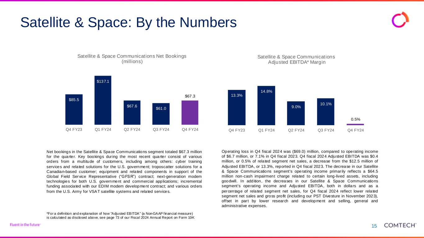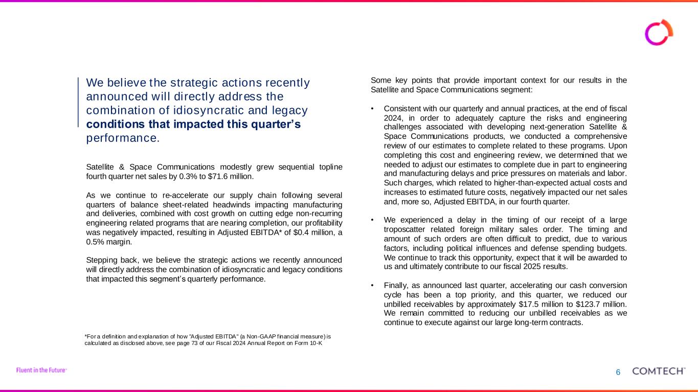 Satellite & Space Communications modestly grew sequential topline fourth quarter net sales by 0.3% to $71.6 million. As we continue to re-accelerate our supply chain following several quarters of balance sheet-related headwinds impacting manufacturing and deliveries, combined with cost growth on cutting edge non-recurring engineering related programs that are nearing completion, our profitability was negatively impacted, resulting in Adjusted EBITDA* of $0.4 million, a 0.5% margin. Stepping back, we believe the strategic actions we recently announced will directly address the combination of idiosyncratic and legacy conditions that impacted this segment’s quarterly performance. Some key points that provide important context for our results in the Satellite and Space Communications segment: • Consistent with our quarterly and annual practices, at the end of fiscal 2024, in order to adequately capture the risks and engineering challenges associated with developing next-generation Satellite & Space Communications products, we conducted a comprehensive review of our estimates to complete related to these programs. Upon completing this cost and engineering review, we determined that we needed to adjust our estimates to complete due in part to engineering and manufacturing delays and price pressures on materials and labor. Such charges, which related to higher-than-expected actual costs and increases to estimated future costs, negatively impacted our net sales and, more so, Adjusted EBITDA, in our fourth quarter. • We experienced a delay in the timing of our receipt of a large troposcatter related foreign military sales order. The timing and amount of such orders are often difficult to predict, due to various factors, including political influences and defense spending budgets. We continue to track this opportunity, expect that it will be awarded to us and ultimately contribute to our fiscal 2025 results. • Finally, as announced last quarter, accelerating our cash conversion cycle has been a top priority, and this quarter, we reduced our unbilled receivables by approximately $17.5 million to $123.7 million. We remain committed to reducing our unbilled receivables as we continue to execute against our large long-term contracts. 6 We believe the strategic actions recently announced will directly address the combination of idiosyncratic and legacy conditions that impacted this quarter’s performance. *For a definit ion and explanation of how "Adjusted EBITDA" (a Non-GAAP f inancial measure) is calculated as disclosed above, see page 73 of our Fiscal 2024 Annual Report on Form 10-K