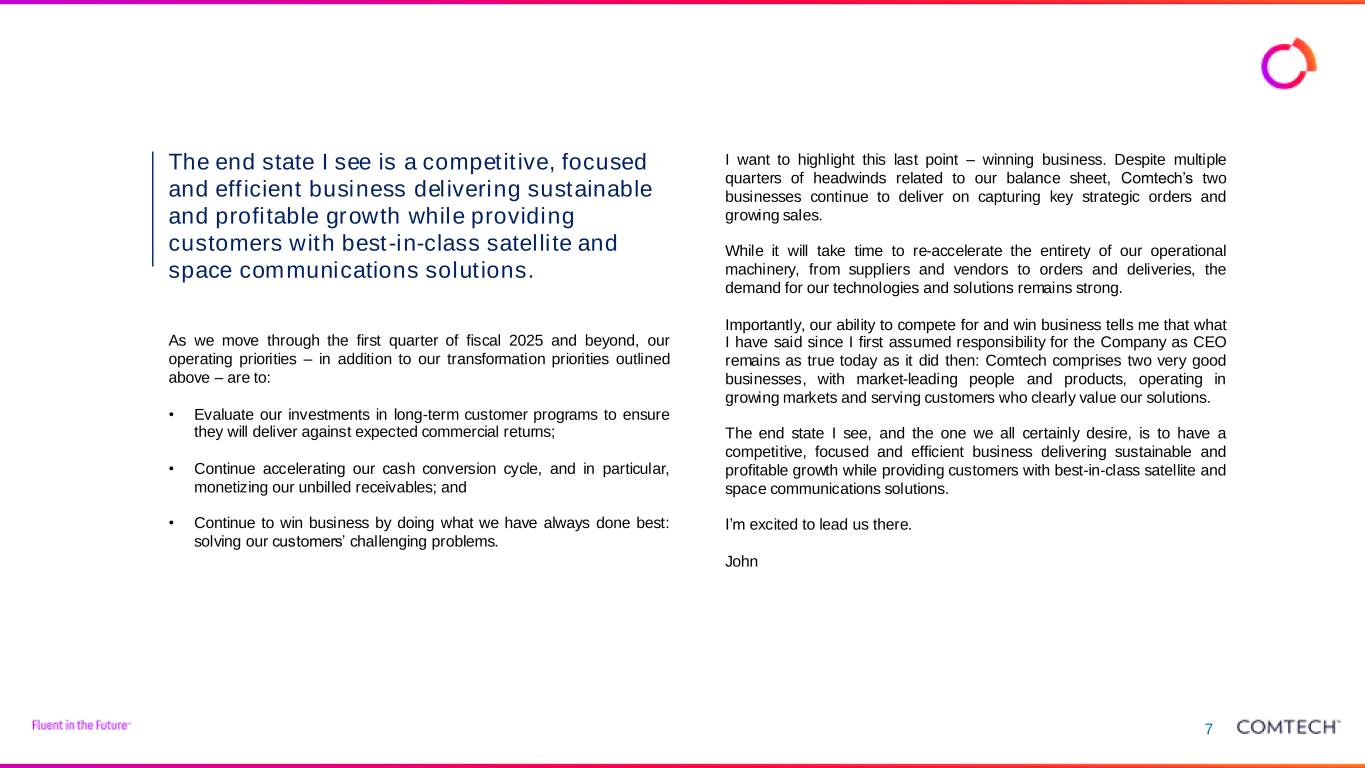 As we move through the first quarter of fiscal 2025 and beyond, our operating priorities – in addition to our transformation priorities outlined above – are to: • Evaluate our investments in long-term customer programs to ensure they will deliver against expected commercial returns; • Continue accelerating our cash conversion cycle, and in particular, monetizing our unbilled receivables; and • Continue to win business by doing what we have always done best: solving our customers’ challenging problems. I want to highlight this last point – winning business. Despite multiple quarters of headwinds related to our balance sheet, Comtech’s two businesses continue to deliver on capturing key strategic orders and growing sales. While it will take time to re-accelerate the entirety of our operational machinery, from suppliers and vendors to orders and deliveries, the demand for our technologies and solutions remains strong. Importantly, our ability to compete for and win business tells me that what I have said since I first assumed responsibility for the Company as CEO remains as true today as it did then: Comtech comprises two very good businesses, with market-leading people and products, operating in growing markets and serving customers who clearly value our solutions. The end state I see, and the one we all certainly desire, is to have a competitive, focused and efficient business delivering sustainable and profitable growth while providing customers with best-in-class satellite and space communications solutions. I’m excited to lead us there. John 7 The end state I see is a competitive, focused and efficient business delivering sustainable and profitable growth while providing customers with best-in-class satellite and space communications solutions.