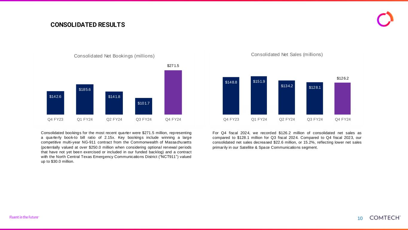 CONSOLIDATED RESULTS 10 Consolidated bookings for the most recent quarter were $271.5 million, representing a quarterly book-to bill ratio of 2.15x. Key bookings include winning a large competitive multi-year NG-911 contract from the Commonwealth of Massachusetts (potentially valued at over $250.0 million when considering optional renewal per iods that have not yet been exercised or included in our funded backlog) and a contract with the North Central Texas Emergency Communications District (“NCT911”) valued up to $30.0 million. $142.6 $185.6 $141.8 $101.7 $271.5 Q4 FY23 Q1 FY24 Q2 FY24 Q3 FY24 Q4 FY24 Consolidated Net Bookings (millions) For Q4 fiscal 2024, we recorded $126.2 million of consolidated net sales as compared to $128.1 million for Q3 fiscal 2024. Compared to Q4 fiscal 2023, our consolidated net sales decreased $22.6 million, or 15.2%, reflecting lower net sales primar ily in our Satellite & Space Communications segment. $148.8 $151.9 $134.2 $128.1 $126.2 Q4 FY23 Q1 FY24 Q2 FY24 Q3 FY24 Q4 FY24 Consolidated Net Sales (millions)