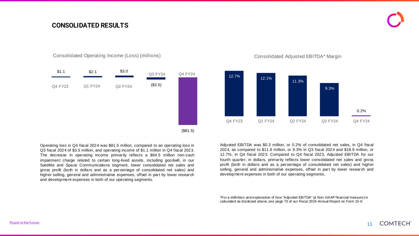 CONSOLIDATED RESULTS 11 Operating loss in Q4 fiscal 2024 was $81.5 million, compared to an operating loss in Q3 fiscal 2024 of $3.5 million, and operating income of $1.1 million in Q4 fiscal 2023. The decrease in operating income primar ily reflects a $64.5 million non-cash impairment charge related to certain long-lived assets, including goodwill, in our Satellite and Space Communications segment, lower consolidated net sales and gross profit (both in dollars and as a percentage of consolidated net sales) and higher selling, general and administrative expenses, offset in par t by lower research and development expenses in both of our operating segments. $1.1 $2.1 $3.0 ($3.5) ($81.5) Consolidated Operating Income (Loss) (millions) Q4 FY23 Q4 FY24Q3 FY24 Q2 FY24Q1 FY24 Adjusted EBITDA was $0.3 million, or 0.2% of consolidated net sales, in Q4 fiscal 2024, as compared to $11.9 million, or 9.3% in Q3 fiscal 2024 and $18.9 million, or 12.7%, in Q4 fiscal 2023. Compared to Q4 fiscal 2023, Adjusted EBITDA for our fourth quarter, in dollars, primar ily reflects lower consolidated net sales and gross profit (both in dollars and as a percentage of consolidated net sales) and higher selling, general and administrative expenses, offset in par t by lower research and development expenses in both of our operating segments. 12.7% 12.1% 11.3% 9.3% 0.2% Q4 FY23 Q1 FY24 Q2 FY24 Q3 FY24 Q4 FY24 Consolidated Adjusted EBITDA* Margin *For a definit ion and explanation of how "Adjusted EBITDA" (a Non-GAAP f inancial measure) is calculated as disclosed above, see page 73 of our Fiscal 2024 Annual Report on Form 10-K