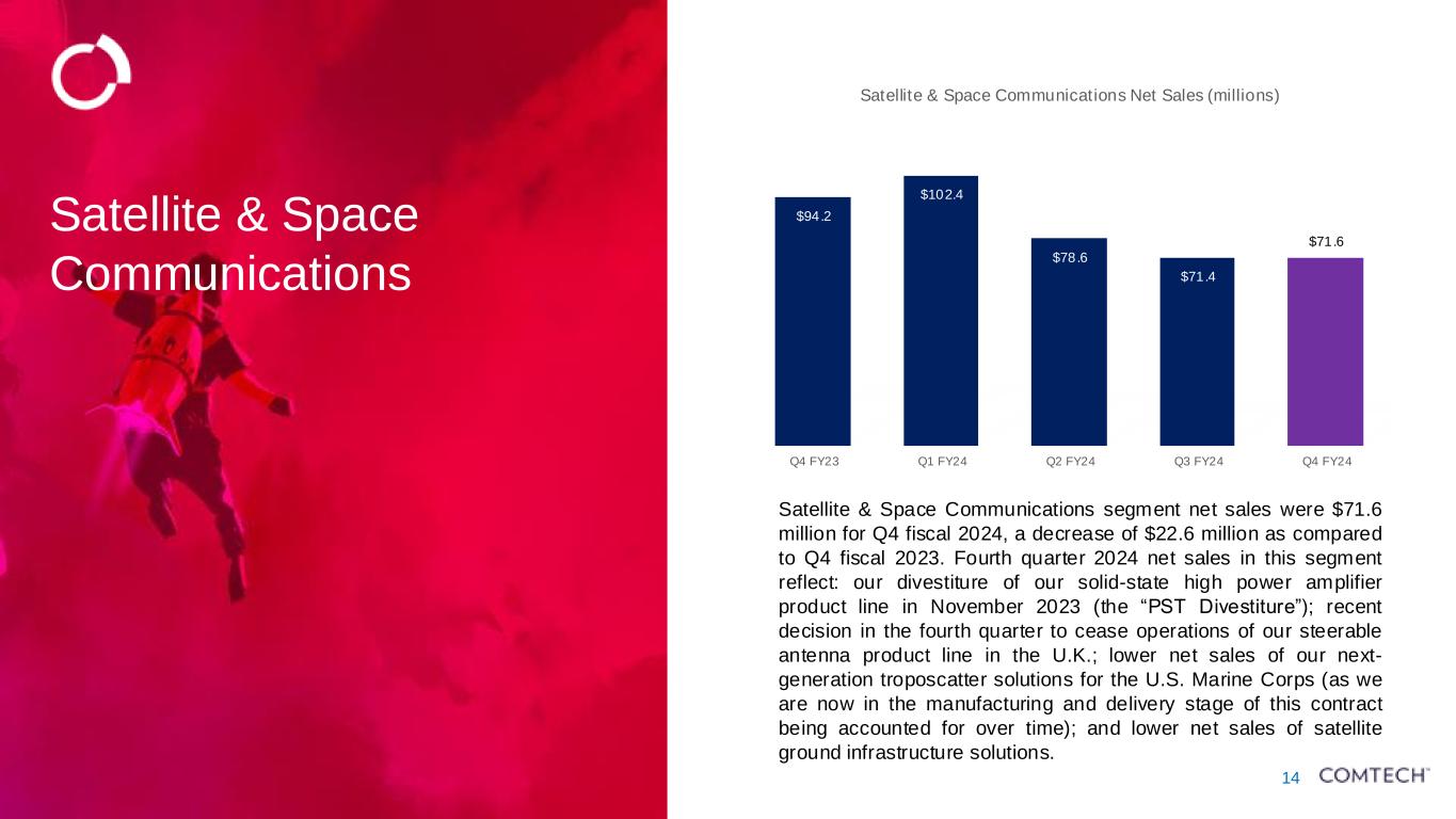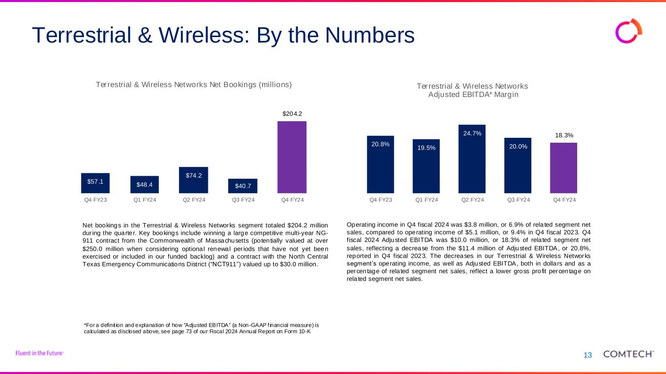 13 *For a definit ion and explanation of how "Adjusted EBITDA" (a Non-GAAP f inancial measure) is calculated as disclosed above, see page 73 of our Fiscal 2024 Annual Report on Form 10-K 20.8% 19.5% 24.7% 20.0% 18.3% Q4 FY23 Q1 FY24 Q2 FY24 Q3 FY24 Q4 FY24 Terrestrial & Wireless Networks Adjusted EBITDA* Margin $57.1 $48.4 $74.2 $40.7 $204.2 Q4 FY23 Q1 FY24 Q2 FY24 Q3 FY24 Q4 FY24 Terrestrial & Wireless Networks Net Bookings (millions) Operating income in Q4 fiscal 2024 was $3.8 million, or 6.9% of rela ted segment net sales, compared to operating income of $5.1 million, or 9.4% in Q4 fiscal 2023. Q4 fiscal 2024 Adjusted EBITDA was $10.0 million, or 18.3% of related segment net sales, reflecting a decrease from the $11.4 million of Adjusted EBITDA, or 20.8%, reported in Q4 fiscal 2023. The decreases in our Terrestrial & Wireless Networks segment’s operating income, as well as Adjusted EBITDA, both in dollars and as a percentage of rela ted segment net sales, reflect a lower gross profit percentage on rela ted segment net sales. Net bookings in the Terrestrial & Wireless Networks segment totaled $204.2 million dur ing the quarter. Key bookings include winning a large competitive multi-year NG- 911 contract from the Commonwealth of Massachusetts (potentially valued at over $250.0 million when considering optional renewal per iods that have not yet been exercised or included in our funded backlog) and a contract with the North Central Texas Emergency Communications District (“NCT911”) valued up to $30.0 million. Terrestrial & Wireless: By the Numbers