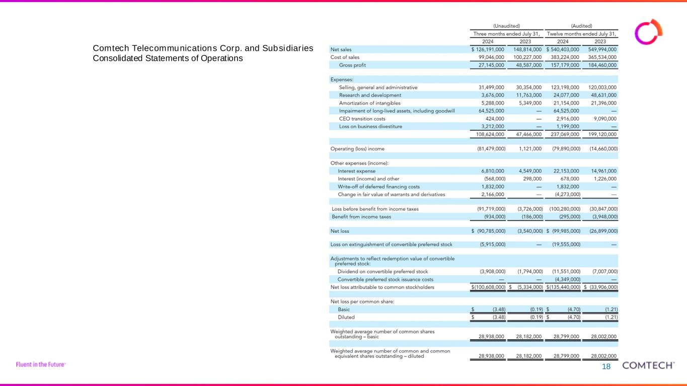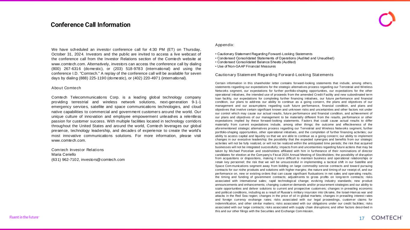 17 Conference Call Information We have scheduled an investor conference call for 4:30 PM (ET) on Thursday, October 31, 2024. Investors and the public are invited to access a live webcast of the conference call from the Investor Relations section of the Comtech website at www.comtech.com. Alternatively, investors can access the conference call by dialing (800) 267-6316 (domestic), or (203) 518-9783 (international) and using the conference I.D. "Comtech." A replay of the conference call will be available for seven days by dialing (888) 225-1190 (domestic), or (402) 220-4971 (international). About Comtech Comtech Telecommunications Corp. is a leading global technology company providing terrestrial and wireless network solutions, next-generation 9-1-1 emergency services, satellite and space communications technologies, and cloud native capabilities to commercial and government customers around the world. Our unique culture of innovation and employee empowerment unleashes a relentless passion for customer success. With multiple facilities located in technology corridors throughout the United States and around the world, Comtech leverages our global presence, technology leadership, and decades of experience to create the world’s most innovative communications solutions. For more information, please visit www.comtech.com. Comtech Investor Relations Maria Ceriello (631) 962-7102, investors@comtech.com Appendix: • Cautionary Statement Regarding Forward-Looking Statements • Condensed Consolidated Statements of Operations (Audited and Unaudited) • Condensed Consolidated Balance Sheets (Audited) • Use of Non-GAAP Financial Measures Cautionary Statement Regarding Forward-Looking Statements Certain information in this shareholder letter contains forward-looking statements that include, among others, statements regarding our expectations for the strategic alternatives process regarding our Terrestr ial and Wireless Networks segment, our expectations for further portfolio-shaping opportunities, our expectations for the other operational initiatives, the intended use of proceeds from the amended Credit Facility and new subordinated term loan facility, our expectations for completing further financing initiatives, our future performance and financial condition, our plans to address our ability to continue as a going concern, the plans and objectives of our management and our assum ptions regarding such future performance, financial condition, and plans and objectives that involve certain significant known and unknown risks and uncertainties and other factors not under our control which may cause our actual results, future performance and financial condition, and achievement of our plans and objectives of our management to be materially different from the results, performance or other expectations implied by these forward-looking statements. Factors that could cause actual results to differ materially from current expectations include, among other things: the outcome and effectiveness of the aforementioned strategic alternatives process regarding our Terrestr ial and Wireless Networks segment, further portfolio-shaping opportunities, other operational initiatives, and the completion of further financing activities; our ability to access capital and liquidity so that we are able to continue as a going concern; our ability to implement changes in our executive leadership; the possibility that the expected synergies and benefits from our strategic activities will not be fully realized, or will not be realized within the anticipated time periods; the risk that acquired businesses will not be integrated successfully; impacts from and uncertainties regarding future actions that may be taken by Michael Porcelain and stockholders affiliated with him in furtherance of their nominations of director candidates for election at the Com pany’s Fiscal 2024 Annual Meeting of Stockholders; the possibility of disruption from acquisitions or dispositions, making it more difficult to maintain business and operational relationships or retain key personnel; the risk that we will be unsuccessful in implementing a tactical shift in our Satellite and Space Com munications segment away from bidding on large commodity service contracts and toward pursuing contracts for our niche products and solutions with higher margins; the nature and timing of our receipt of, and our performance on, new or existing orders that can cause significant fluctuations in net sales and operating results; the timing and funding of government contracts; adjustm ents to gross profits on long-term contracts; r isks associated with international sales; rapid technological change; evolving industry standards; new product announcements and enhancements; changing custom er demands and/or procurement strategies and our ability to scale opportunities and deliver solutions to current and prospective custom ers; changes in prevailing economic and political conditions, including as a result of Russia’s military incursion into Ukraine, the Israel-Ham as war and attacks in the Red Sea region; changes in the price of oil in global markets; changes in prevailing interest rates and foreign currency exchange rates; r isks associated with our legal proceedings, custom er claims for indemnification, and other sim ilar matters; r isks associated with our obligations under our credit facilities; r isks associated with our large contracts; r isks associated with supply chain disruptions; and other factors described in this and our other filings with the Securities and Exchange Com mission.