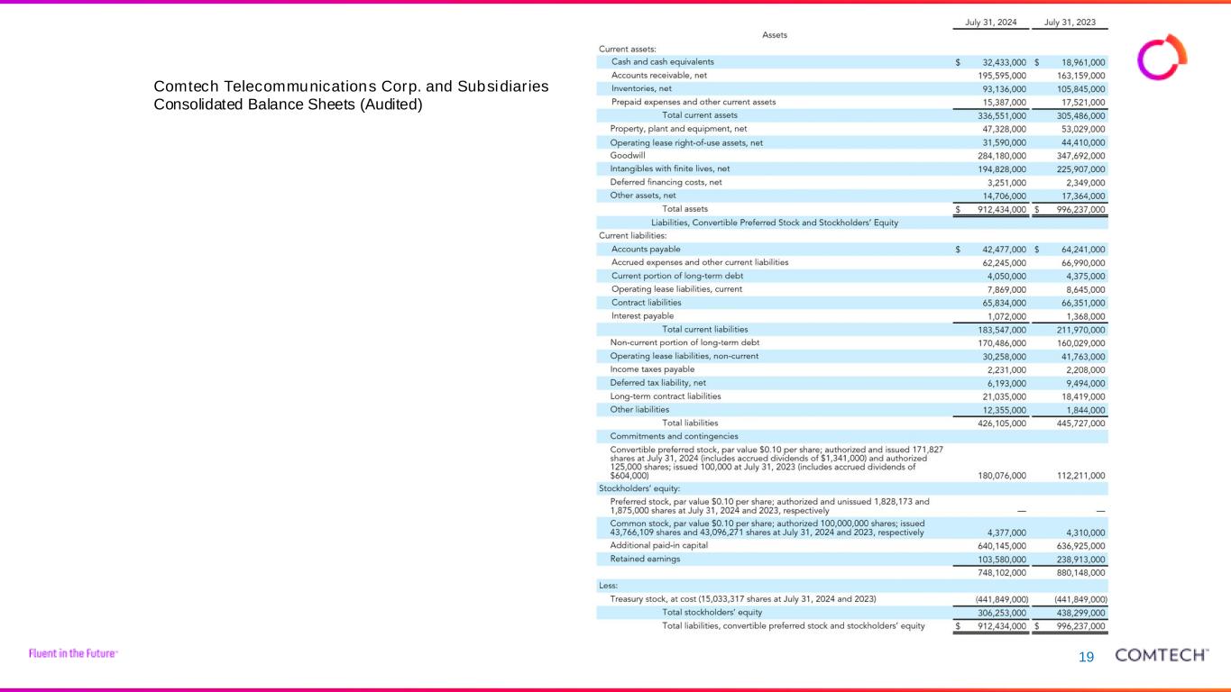 19 Comtech Telecommunications Corp. and Subsidiaries Consolidated Balance Sheets (Audited)
