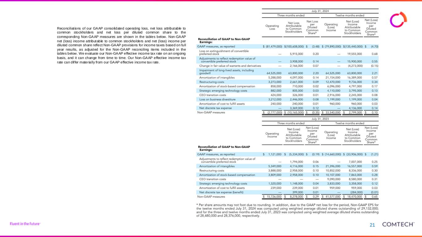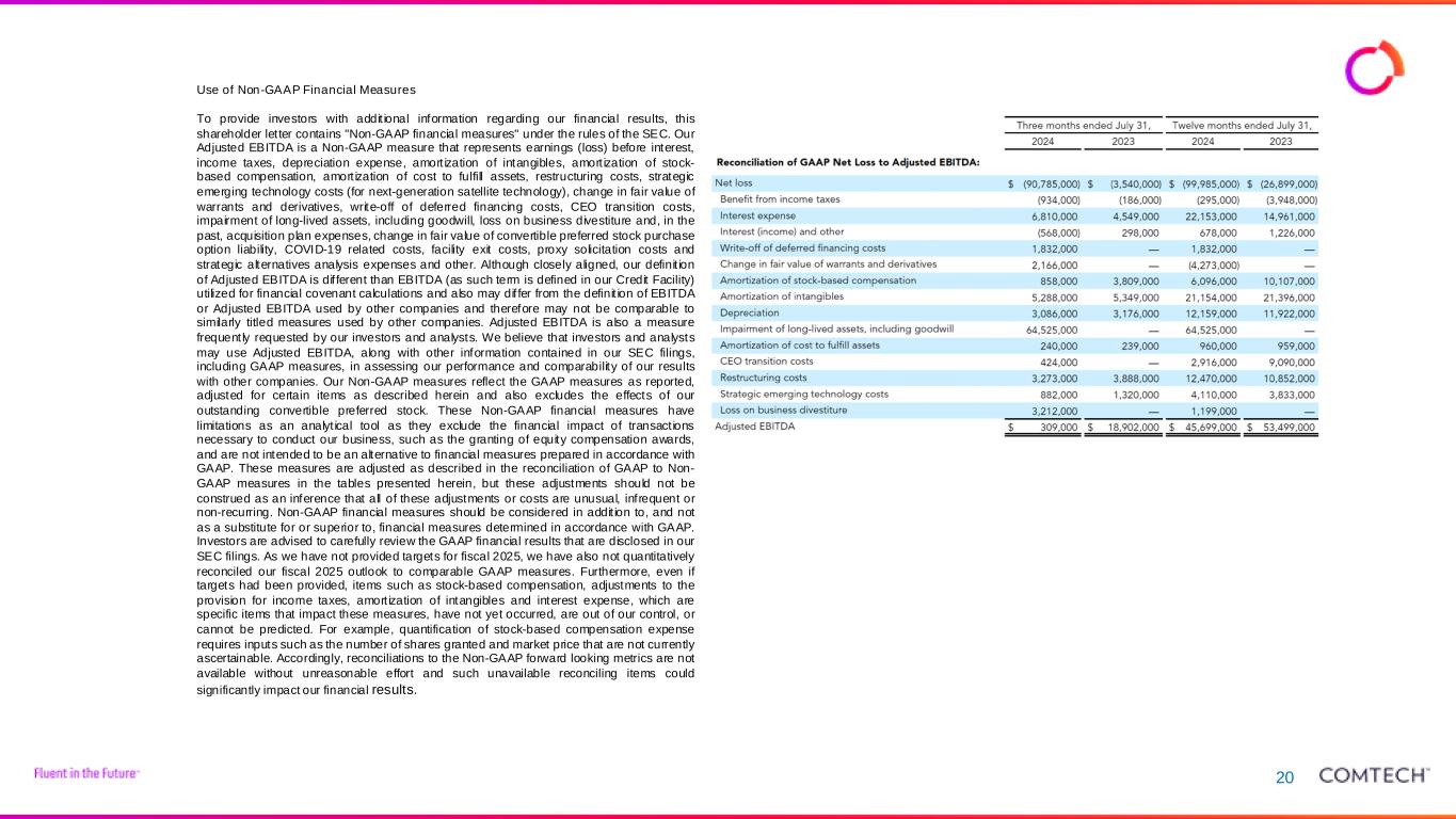 20 Use of Non-GAAP Financial Measures To provide investors with addit ional information regarding our financial results, this shareholder let ter contains "Non-GAAP financial measures" under the rules of the SEC. Our Adjusted EBITDA is a Non-GAAP measure that represents earnings (loss) before interest, income taxes, depreciation expense, amort ization of intangibles, amort ization of stock- based compensation, amort ization of cost to fulfill assets, restructuring costs, strategic emerging technology costs (for next-generation satellite technology), change in fair value of warrants and derivatives, write-off of deferred financing costs, CEO transition costs, impairment of long-lived assets, including goodwill, loss on business divestiture and, in the past, acquisition plan expenses, change in fair value of convertible preferred stock purchase option liability, COVID-19 related costs, facility exit costs, proxy solicitation costs and strategic alternatives analysis expenses and other. Although closely aligned, our definit ion of Adjusted EBITDA is dif ferent than EBITDA (as such term is defined in our Credit Facility) utilized for financial covenant calculations and also may dif fer from the definit ion of EBITDA or Adjusted EBITDA used by other companies and therefore may not be comparable to similarly titled measures used by other companies. Adjusted EBITDA is also a measure frequent ly requested by our investors and analysts. We believe that investors and analysts may use Adjusted EBITDA, along with other information contained in our SEC filings, including GAAP measures, in assessing our performance and comparability of our results with other companies. Our Non-GAAP measures reflect the GAAP measures as reported, adjusted for certain items as described herein and also excludes the effects of our outstanding convertible preferred stock. These Non-GAAP financial measures have limitations as an analyt ical tool as they exclude the financial impact of transactions necessary to conduct our business, such as the granting of equity compensation awards, and are not intended to be an alternative to financial measures prepared in accordance with GAAP. These measures are adjusted as described in the reconciliation of GAAP to Non- GAAP measures in the tables presented herein, but these adjustments should not be construed as an inference that all of these adjustments or costs are unusual, infrequent or non-recurring. Non-GAAP financial measures should be considered in addit ion to, and not as a substitute for or superior to, financial measures determined in accordance with GAAP. Investors are advised to carefully review the GAAP financial results that are disclosed in our SEC filings. As we have not provided targets for fiscal 2025, we have also not quantitatively reconciled our fiscal 2025 outlook to comparable GAAP measures. Furthermore, even if targets had been provided, items such as stock-based compensation, adjustments to the provision for income taxes, amort ization of intangibles and interest expense, which are specific items that impact these measures, have not yet occurred, are out of our control, or cannot be predicted. For example, quantification of stock-based compensation expense requires inputs such as the number of shares granted and market price that are not currently ascertainable. Accordingly, reconciliations to the Non-GAAP forward looking metrics are not available without unreasonable effort and such unavailable reconciling items could significantly impact our financial results.