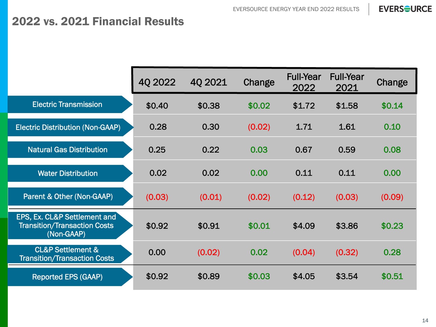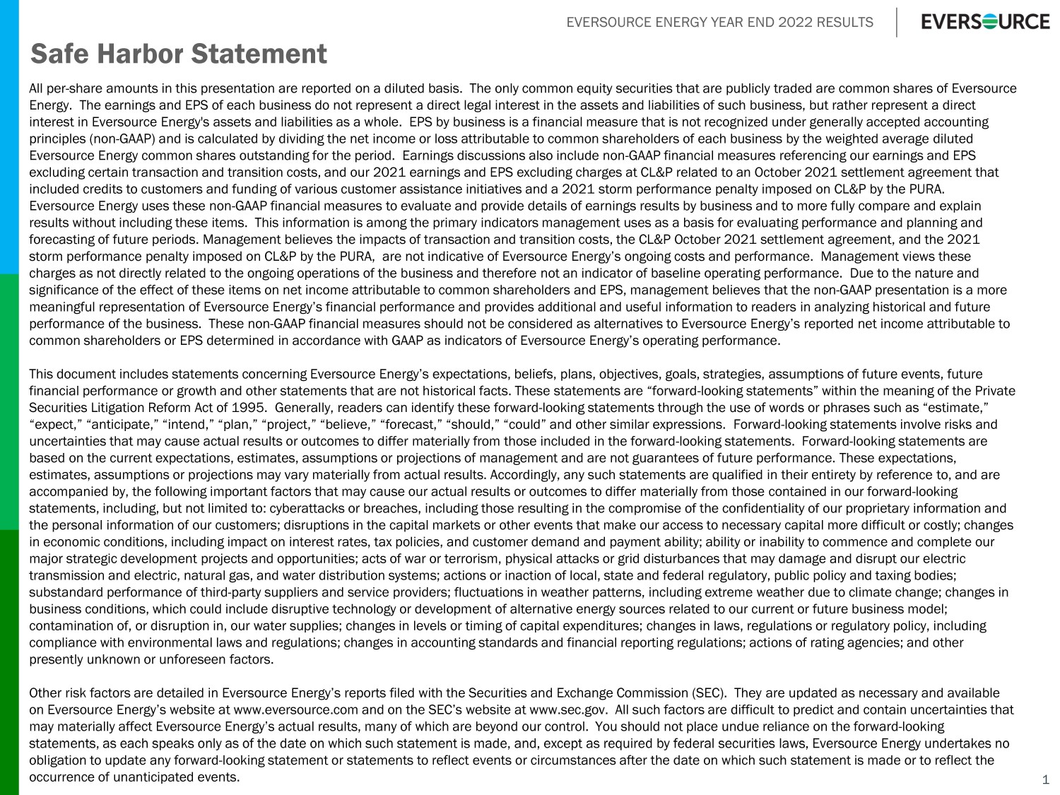 EVERSOURCE ENERGY YEAR END 2022 RESULTS Safe Harbor Statement 1 All per - share amounts in this presentation are reported on a diluted basis. The only common equity securities that are publicly traded are common shares of Eversource Energy. The earnings and EPS of each business do not represent a direct legal interest in the assets and liabilities of such bu siness, but rather represent a direct interest in Eversource Energy's assets and liabilities as a whole. EPS by business is a financial measure that is not recogn ize d under generally accepted accounting principles (non - GAAP) and is calculated by dividing the net income or loss attributable to common shareholders of each business by the weighted average d iluted Eversource Energy common shares outstanding for the period. Earnings discussions also include non - GAAP financial measures refer encing our earnings and EPS excluding certain transaction and transition costs, and our 2021 earnings and EPS excluding charges at CL&P related to an Oct obe r 2021 settlement agreement that included credits to customers and funding of various customer assistance initiatives and a 2021 storm performance penalty imp ose d on CL&P by the PURA. Eversource Energy uses these non - GAAP financial measures to evaluate and provide details of earnings results by business and to more fully compare and explain results without including these items. This information is among the primary indicators management uses as a basis for evalu ati ng performance and planning and forecasting of future periods. Management believes the impacts of transaction and transition costs, the CL&P October 2021 set tle ment agreement, and the 2021 storm performance penalty imposed on CL&P by the PURA, are not indicative of Eversource Energy’s ongoing costs and performan ce. Management views these charges as not directly related to the ongoing operations of the business and therefore not an indicator of baseline operatin g p erformance. Due to the nature and significance of the effect of these items on net income attributable to common shareholders and EPS, management believes that th e non - GAAP presentation is a more meaningful representation of Eversource Energy’s financial performance and provides additional and useful information to read ers in analyzing historical and future performance of the business. These non - GAAP financial measures should not be considered as alternatives to Eversource Energy’s reported net income attributable to common shareholders or EPS determined in accordance with GAAP as indicators of Eversource Energy’s operating performance. This document includes statements concerning Eversource Energy’s expectations, beliefs, plans, objectives, goals, strategies, as sumptions of future events, future financial performance or growth and other statements that are not historical facts. These statements are “forward - looking statem ents” within the meaning of the Private Securities Litigation Reform Act of 1995. Generally, readers can identify these forward - looking statements through the use of w ords or phrases such as “estimate,” “expect,” “anticipate,” “intend,” “plan,” “project,” “believe,” “forecast,” “should,” “could” and other similar expressions. Fo rward - looking statements involve risks and uncertainties that may cause actual results or outcomes to differ materially from those included in the forward - looking statemen ts. Forward - looking statements are based on the current expectations, estimates, assumptions or projections of management and are not guarantees of future perfo rma nce. These expectations, estimates, assumptions or projections may vary materially from actual results. Accordingly, any such statements are qualified in their entirety by reference to, and are accompanied by, the following important factors that may cause our actual results or outcomes to differ materially from those co ntained in our forward - looking statements, including, but not limited to : cyberattacks or breaches, including those resulting in the compromise of the confidentiality of our proprietary information an d the personal information of our customers; disruptions in the capital markets or other events that make our access to necessa ry capital more difficult or costly; changes in economic conditions, including impact on interest rates, tax policies, and customer demand and payment ability; ability or in ability to commence and complete our major strategic development projects and opportunities; acts of war or terrorism, physical attacks or grid disturbances that may damage and disrupt our electric transmission and electric, natural gas, and water distribution systems; actions or inaction of local, state and federal regul ato ry, public policy and taxing bodies; substandard performance of third - party suppliers and service providers; fluctuations in weather patterns, including extreme weat her due to climate change; changes in business conditions, which could include disruptive technology or development of alternative energy sources related to our cu rre nt or future business model; contamination of, or disruption in, our water supplies; changes in levels or timing of capital expenditures; changes in laws, re gulations or regulatory policy, including compliance with environmental laws and regulations; changes in accounting standards and financial reporting regulations; acti ons of rating agencies; and other presently unknown or unforeseen factors. Other risk factors are detailed in Eversource Energy’s reports filed with the Securities and Exchange Commission (SEC). They ar e updated as necessary and available on Eversource Energy’s website at www.eversource.com and on the SEC’s website at www.sec.gov. All such factors are difficult to predict and contain uncertainties that may materially affect Eversource Energy’s actual results, many of which are beyond our control. You should not place undue 