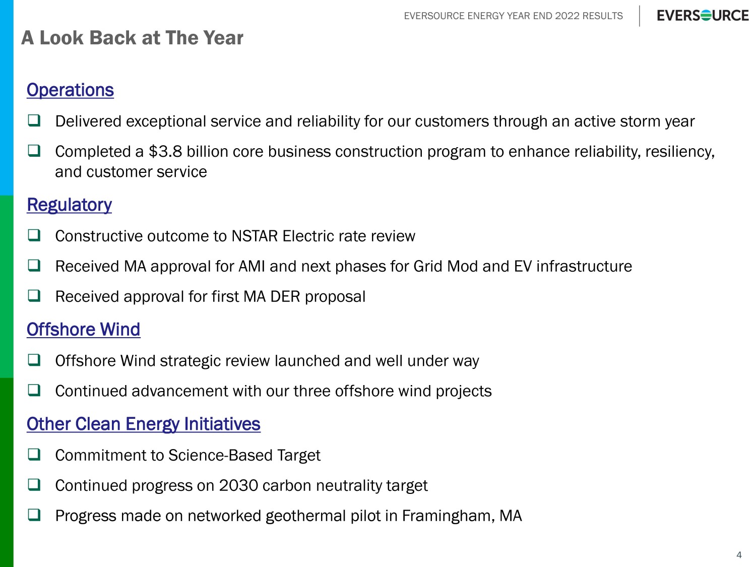 EVERSOURCE ENERGY YEAR END 2022 RESULTS Agenda 2 Joe Nolan Chairman, President & CEO John Moreira EVP, CFO & Treasurer □ 2022 – Year in Review □ Offshore Wind Update □ Clean Energy Initiatives □ 2022 Financial Results □ 2023 Earnings Guidance □ 2023 – 2027 Outlook □ Regulatory and Equity Issuance Update