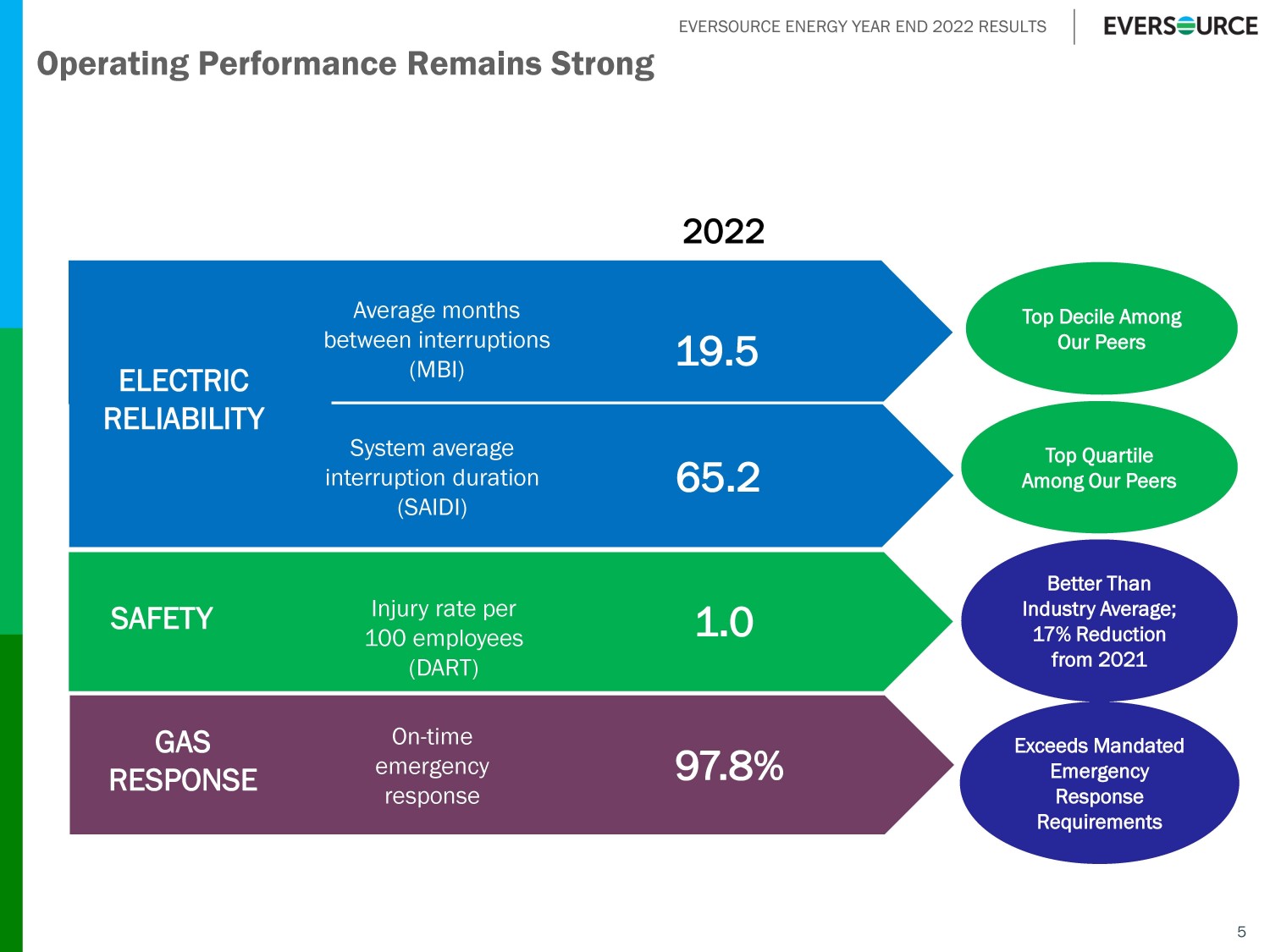 EVERSOURCE ENERGY YEAR END 2022 RESULTS Operating Performance Remains Strong SAFETY Injury rate per 100 employees (DART) Average months between interruptions (MBI) System average interruption duration (SAIDI) On - time emergency response GAS RESPONSE ELECTRIC RELIABILITY 2022 Top Quartile Among Our Peers 65.2 1.0 19.5 97.8% Top Decile Among Our Peers 5 Better Than Industry Average; 17% Reduction from 2021 Exceeds Mandated Emergency Response Requirements