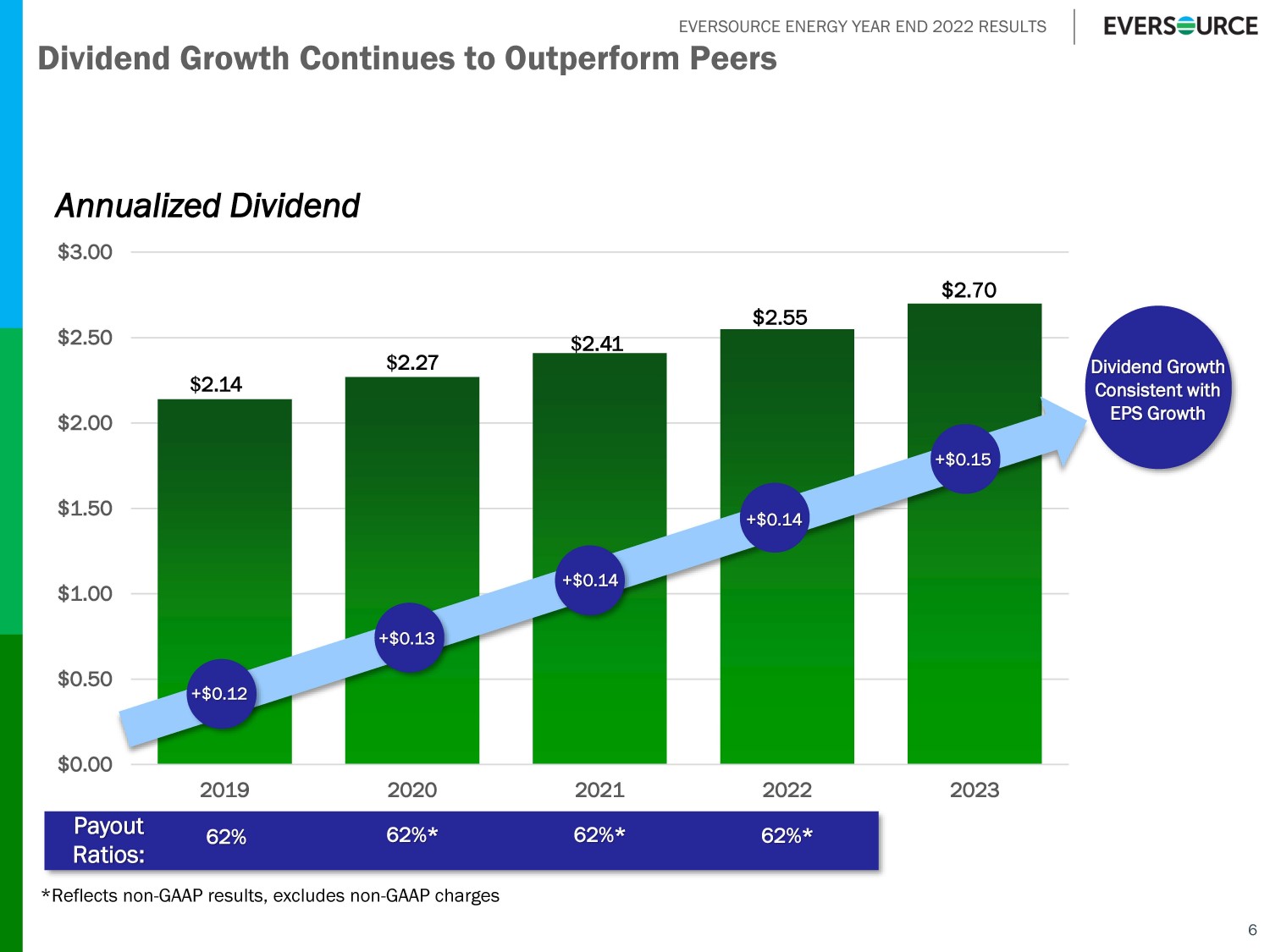 EVERSOURCE ENERGY YEAR END 2022 RESULTS $0.00 $0.50 $1.00 $1.50 $2.00 $2.50 $3.00 2019 2020 2021 2022 2023 $ 2.27 Dividend Growth Continues to Outperform Peers 6 Annualized Dividend Dividend Growth Consistent with EPS Growth Payout Ratios: 62% 62%* 62%* 62%* +$0.12 +$0.13 +$0.14 +$0.14 $2.55 $ 2.14 $ 2.41 *Reflects non - GAAP results, excludes non - GAAP charges +$0.15 $2.70