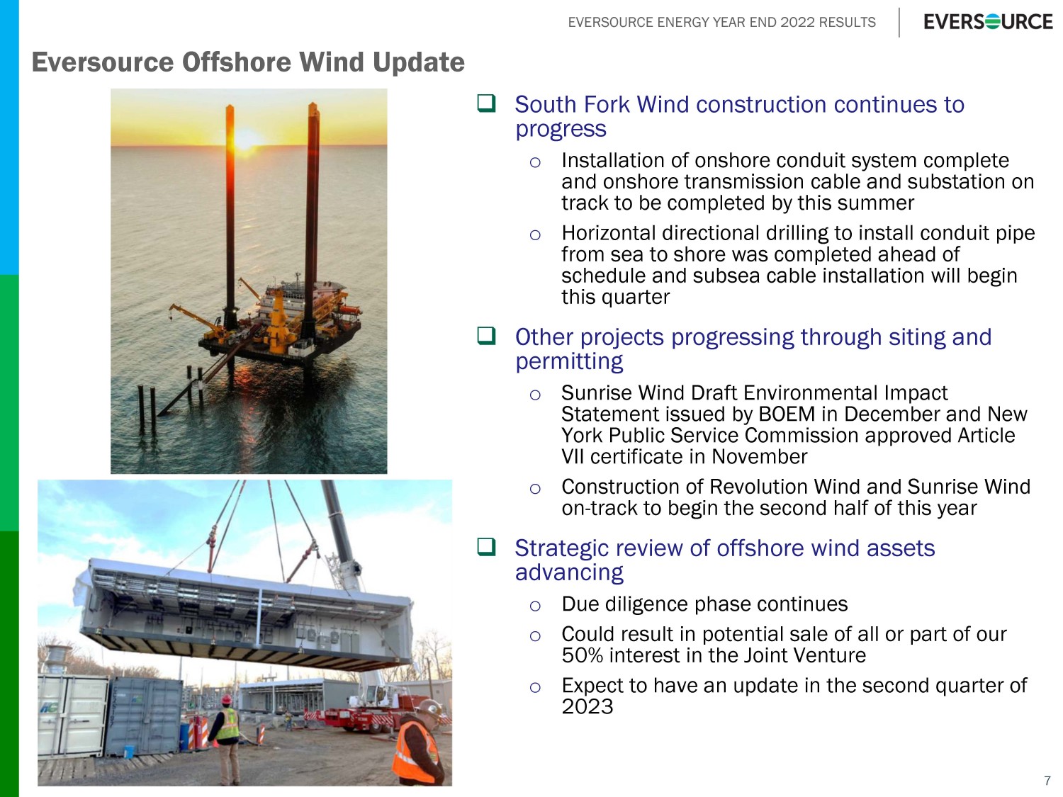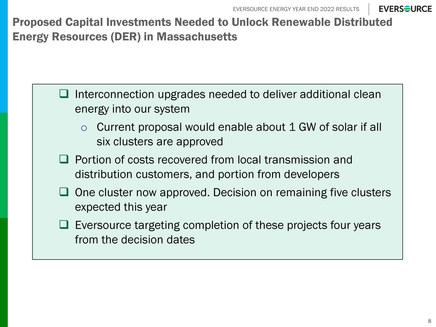 EVERSOURCE ENERGY YEAR END 2022 RESULTS Eversource Offshore Wind Update □ South Fork Wind construction continues to progress o Installation of onshore conduit system complete and onshore transmission cable and substation on track to be completed by this summer o Horizontal directional drilling to install conduit pipe from sea to shore was completed ahead of schedule and subsea cable installation will begin this quarter □ Other projects progressing through siting and permitting o Sunrise Wind Draft Environmental Impact Statement issued by BOEM in December and New York Public Service Commission approved Article VII certificate in November o Construction of Revolution Wind and Sunrise Wind on - track to begin the second half of this year □ Strategic review of offshore wind assets advancing o Due diligence phase continues o Could result in potential sale of all or part of our 50% interest in the Joint Venture o Expect to have an update in the second quarter of 2023 7