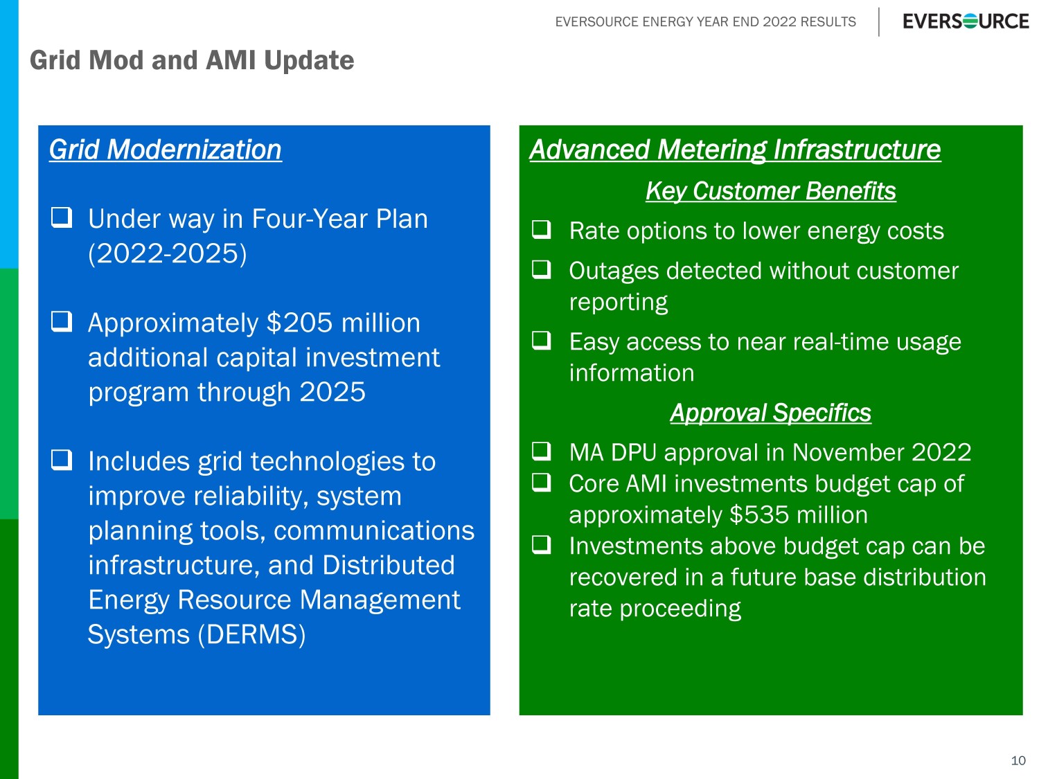 EVERSOURCE ENERGY YEAR END 2022 RESULTS Grid Modernization □ Under way in Four - Year Plan (2022 - 2025) □ Approximately $205 million additional capital investment program through 2025 □ Includes grid technologies to improve reliability, system planning tools, communications infrastructure, and Distributed Energy Resource Management Systems (DERMS) 10 Grid Mod and AMI Update Advanced Metering Infrastructure Key Customer Benefits □ Rate options to lower energy costs □ Outages detected without customer reporting □ Easy access to near real - time usage information Approval Specifics □ MA DPU approval in November 2022 □ Core AMI investments budget cap of approximately $535 million □ Investments above budget cap can be recovered in a future base distribution rate proceeding