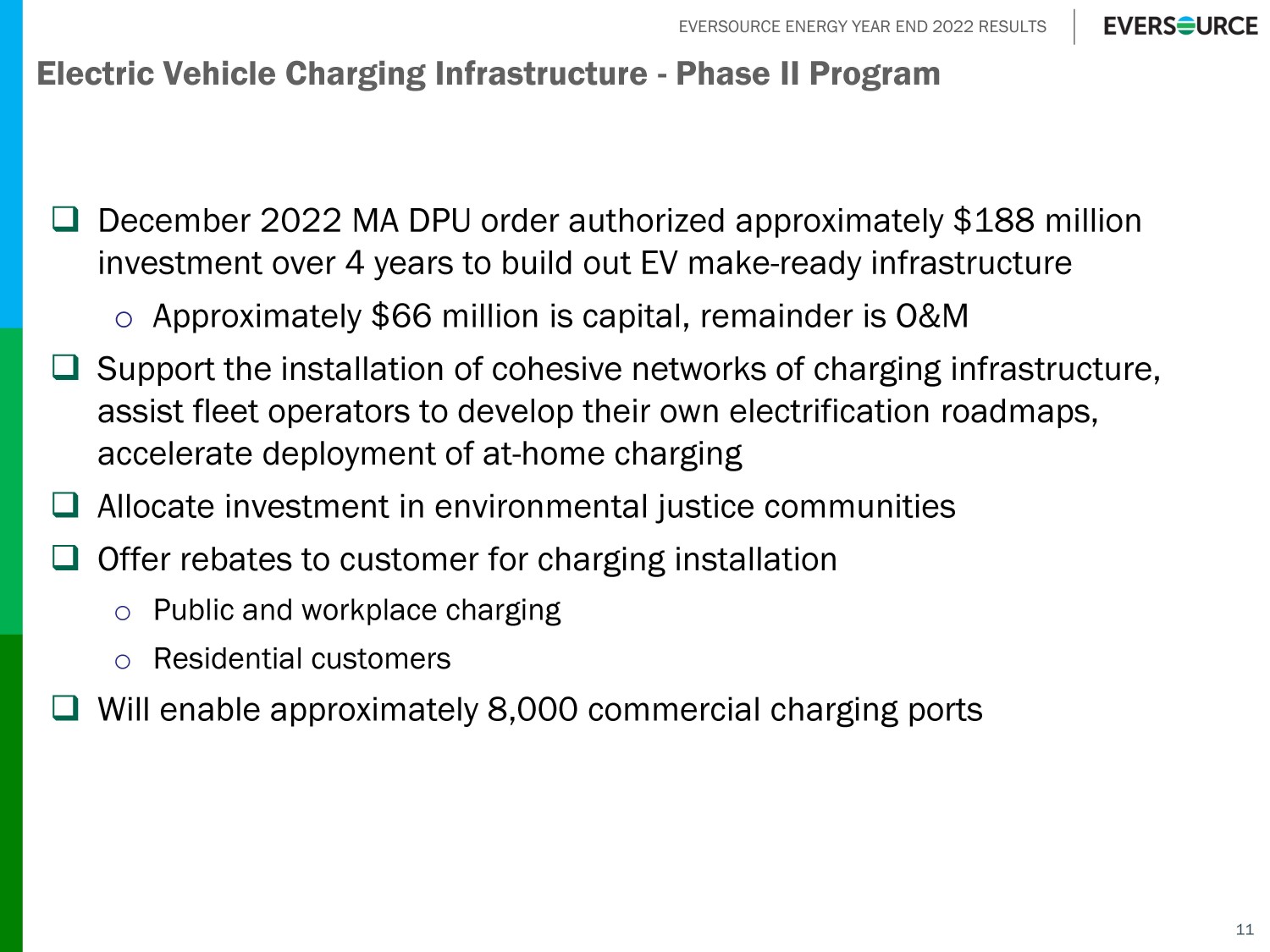 EVERSOURCE ENERGY YEAR END 2022 RESULTS 11 Electric Vehicle Charging Infrastructure - Phase II Program □ December 2022 MA DPU order authorized approximately $188 million investment over 4 years to build out EV make - ready infrastructure o Approximately $66 million is capital, remainder is O&M □ Support the installation of cohesive networks of charging infrastructure, assist fleet operators to develop their own electrification roadmaps, accelerate deployment of at - home charging □ Allocate investment in environmental justice communities □ Offer rebates to customer for charging installation o Public and workplace charging o Residential customers □ Will enable approximately 8,000 commercial charging ports