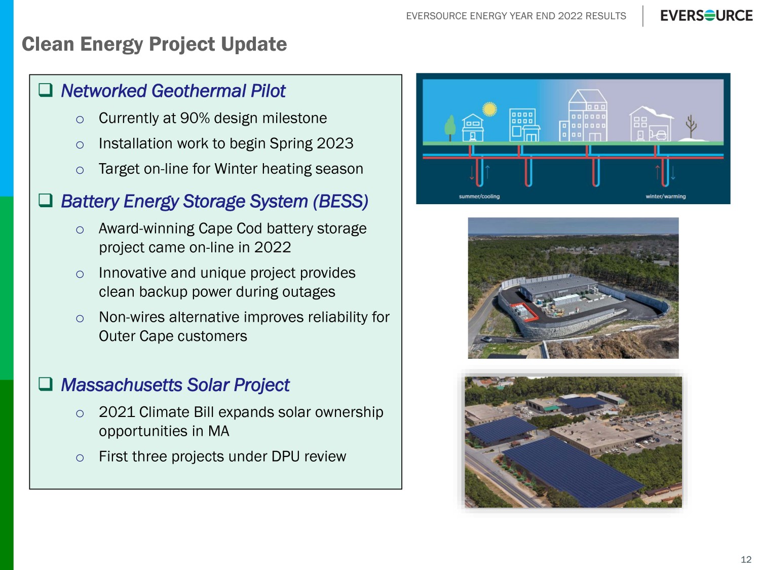 EVERSOURCE ENERGY YEAR END 2022 RESULTS 12 Clean Energy Project Update □ Networked Geothermal Pilot o Currently at 90% design milestone o Installation work to begin Spring 2023 o Target on - line for Winter heating season □ Battery Energy Storage System (BESS) o Award - winning Cape Cod battery storage project came on - line in 2022 o Innovative and unique project provides clean backup power during outages o Non - wires alternative improves reliability for Outer Cape customers □ Massachusetts Solar Project o 2021 Climate Bill expands solar ownership opportunities in MA o First three projects under DPU review