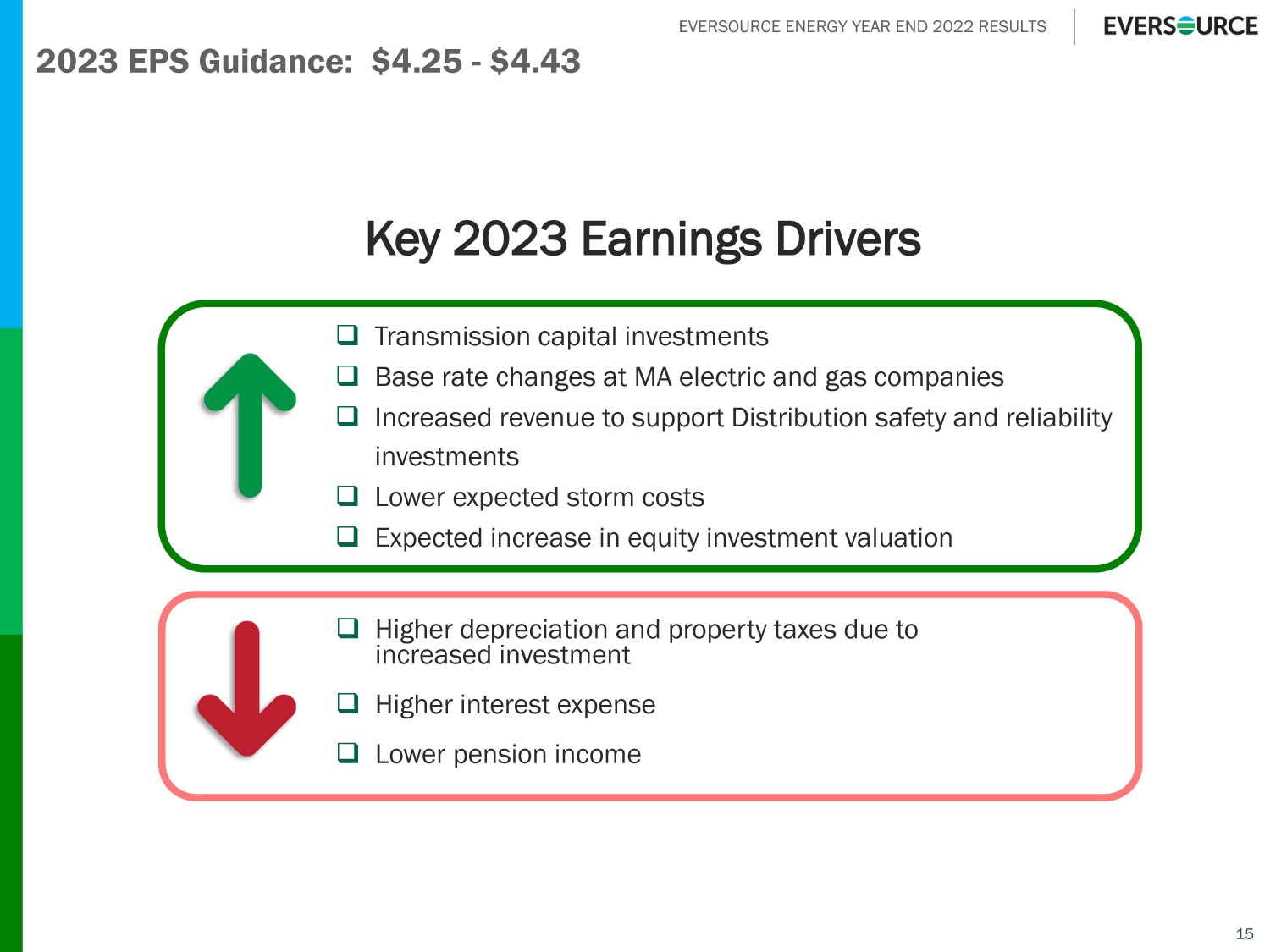 EVERSOURCE ENERGY YEAR END 2022 RESULTS 14 4Q 2022 4Q 2021 Change Full - Year 2022 Full - Year 2021 Change $0.40 $0.38 $0.02 $1.72 $1.58 $0.14 0.28 0.30 (0.02) 1.71 1.61 0.10 0.25 0.22 0.03 0.67 0.59 0.08 0.02 0.02 0.00 0.11 0.11 0.00 (0.03) (0.01) (0.02) (0.12) (0.03) (0.09) $0.92 $0.91 $0.01 $4.09 $3.86 $0.23 0.00 (0.02) 0.02 (0.04) (0.32) 0.28 $0.92 $0.89 $0.03 $4.05 $3.54 $0.51 Electric Transmission Electric Distribution (Non - GAAP) Natural Gas Distribution Parent & Other (Non - GAAP) Water Distribution EPS, Ex. CL&P Settlement and Transition/Transaction Costs (Non - GAAP) CL&P Settlement & Transition/Transaction Costs Reported EPS (GAAP) 2022 vs. 2021 Financial Results