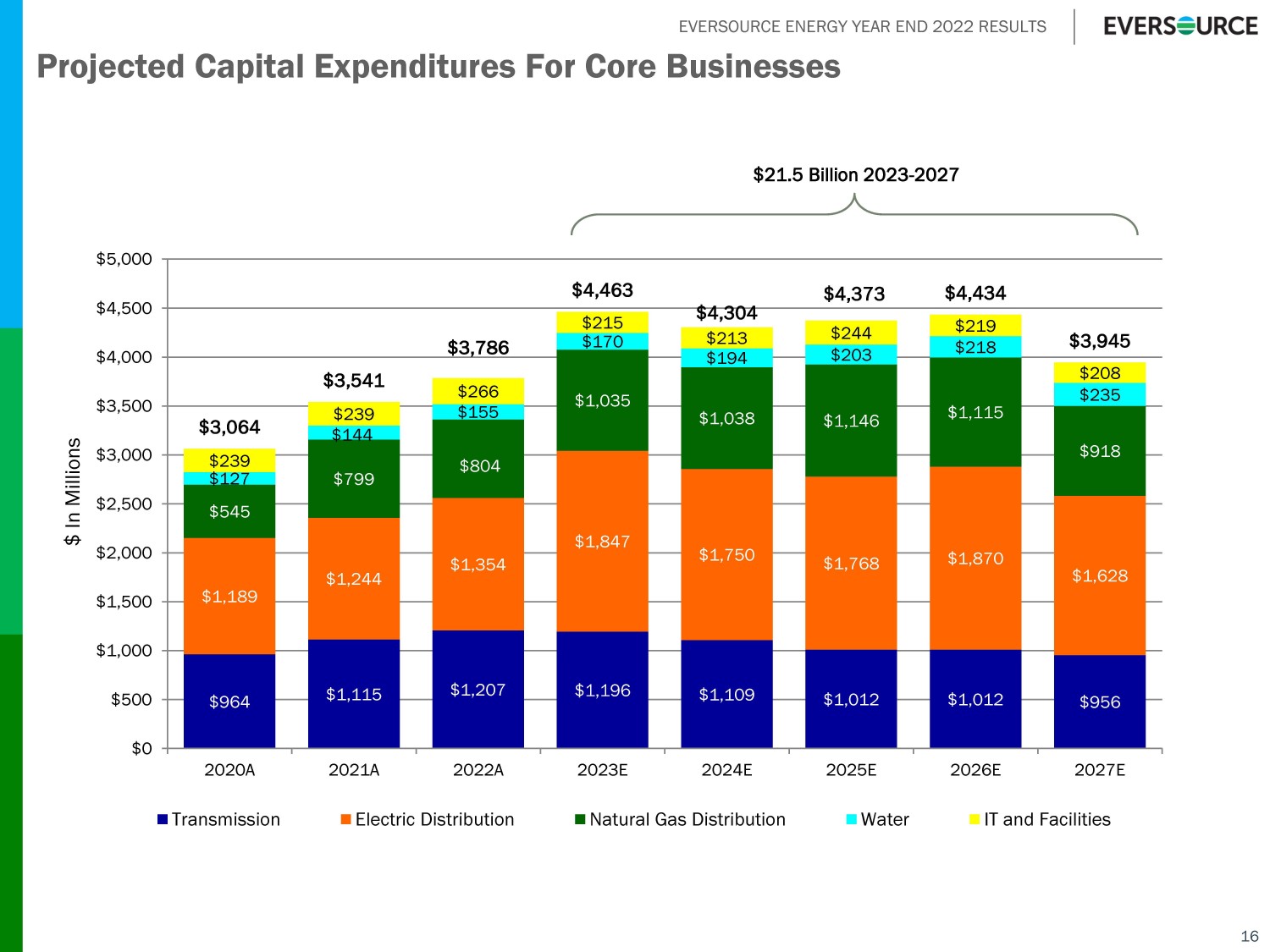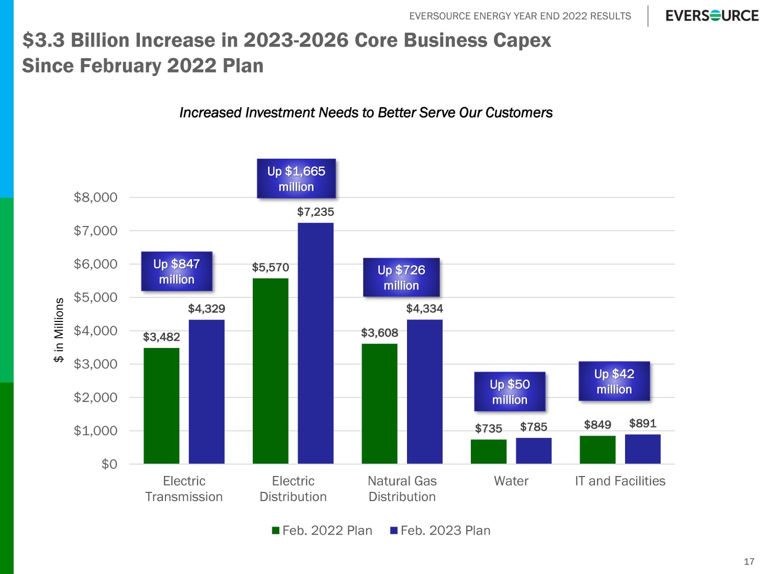EVERSOURCE ENERGY YEAR END 2022 RESULTS Projected Capital Expenditures For Core Businesses 16 $964 $1,115 $1,207 $1,196 $1,109 $1,012 $1,012 $956 $1,189 $1,244 $1,354 $1,847 $1,750 $1,768 $1,870 $1,628 $545 $799 $804 $1,035 $1,038 $1,146 $1,115 $918 $127 $144 $155 $170 $194 $203 $218 $235 $239 $239 $266 $215 $213 $244 $219 $208 $3,064 $3,541 $3,786 $4,463 $4,304 $4,373 $4,434 $3,945 $0 $500 $1,000 $1,500 $2,000 $2,500 $3,000 $3,500 $4,000 $4,500 $5,000 2020A 2021A 2022A 2023E 2024E 2025E 2026E 2027E Transmission Electric Distribution Natural Gas Distribution Water IT and Facilities $ In Millions $21.5 Billion 2023 - 2027