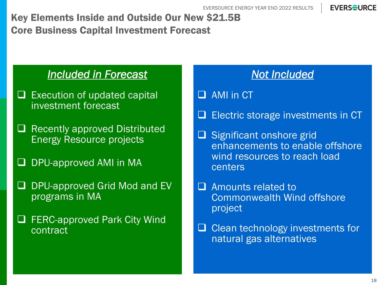 EVERSOURCE ENERGY YEAR END 2022 RESULTS $3.3 Billion Increase in 2023 - 2026 Core Business Capex Since February 2022 Plan 17 $3,482 $5,570 $3,608 $735 $849 $4,329 $7,235 $4,334 $785 $891 $0 $1,000 $2,000 $3,000 $4,000 $5,000 $6,000 $7,000 $8,000 Electric Transmission Electric Distribution Natural Gas Distribution Water IT and Facilities Feb. 2022 Plan Feb. 2023 Plan Up $42 million $ in Millions Up $847 million Up $50 million Up $726 million Up $1,665 million Increased Investment Needs to Better Serve Our Customers