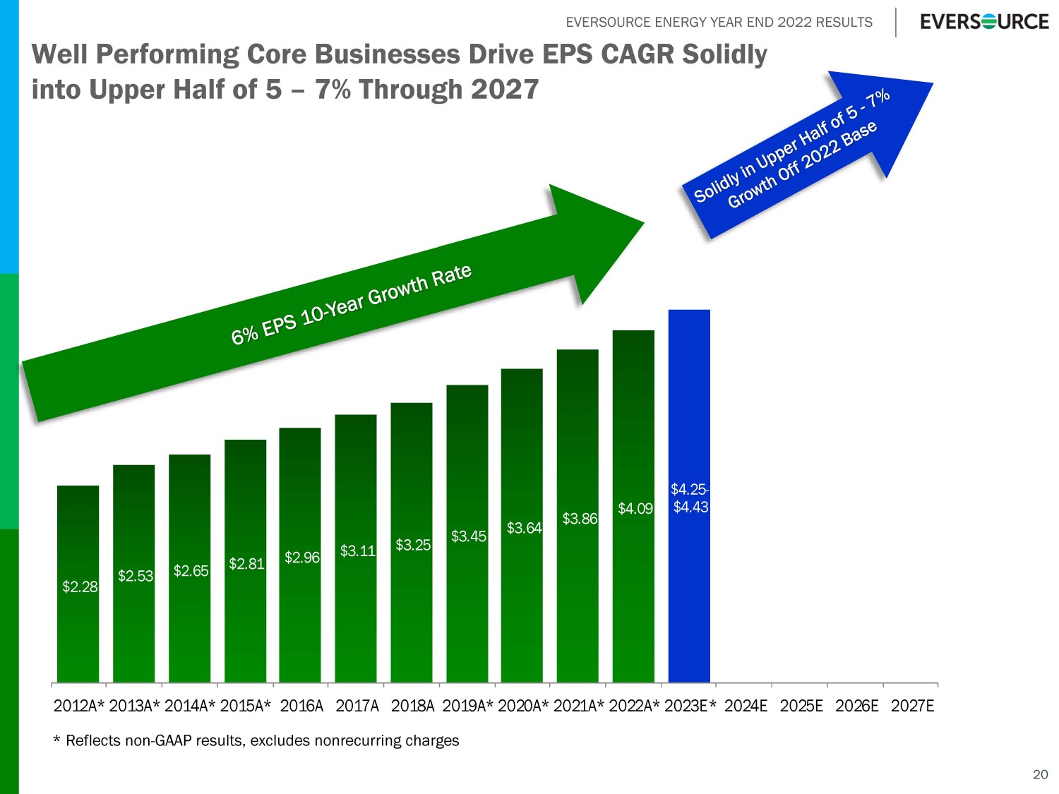 EVERSOURCE ENERGY YEAR END 2022 RESULTS 36% 31% 43% 42% 17% 22% 4% 5% Transmission Electric Distribution Natural Gas Distribution Water 2021 Year - End Rate Base Projected 2027 Year - End Rate Base $24.4 billion* $37.7 billion* 19 Rate Base by Core Line of Business – Current and Future Note: Excludes offshore wind investments * Rate base estimates exclude certain CWIP balances which totaled approximately $2 billion at the end of 2021 and are expected to increase to approximately $3 billion by the end of 2027