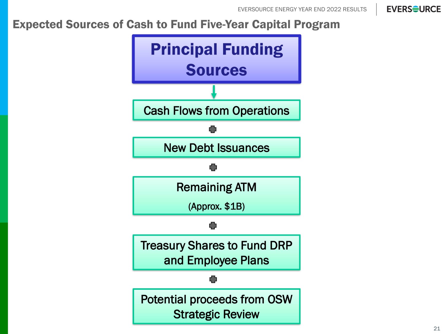 EVERSOURCE ENERGY YEAR END 2022 RESULTS 21 Expected Sources of Cash to Fund Five - Year Capital Program Principal Funding Sources Remaining ATM (Approx. $1B) Cash Flows from Operations Potential proceeds from OSW Strategic Review New Debt Issuances Treasury Shares to Fund DRP and Employee Plans
