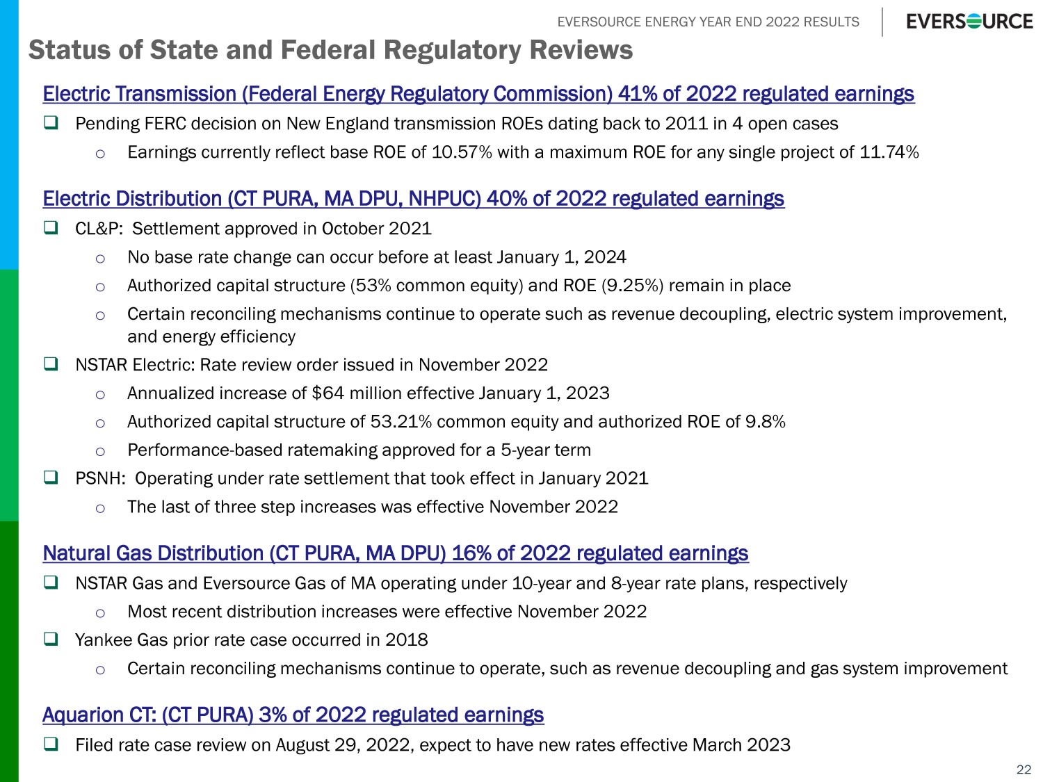 EVERSOURCE ENERGY YEAR END 2022 RESULTS 22 Status of State and Federal Regulatory Reviews Electric Transmission (Federal Energy Regulatory Commission) 41% of 2022 regulated earnings □ Pending FERC decision on New England transmission ROEs dating back to 2011 in 4 open cases o Earnings currently reflect base ROE of 10.57% with a maximum ROE for any single project of 11.74% Electric Distribution (CT PURA, MA DPU, NHPUC) 40% of 2022 regulated earnings □ CL&P: Settlement approved in October 2021 o No base rate change can occur before at least January 1, 2024 o Authorized capital structure (53% common equity) and ROE (9.25%) remain in place o Certain reconciling mechanisms continue to operate such as revenue decoupling, electric system improvement, and energy efficiency □ NSTAR Electric: Rate review order issued in November 2022 o Annualized increase of $64 million effective January 1, 2023 o Authorized capital structure of 53.21% common equity and authorized ROE of 9.8% o Performance - based ratemaking approved for a 5 - year term □ PSNH: Operating under rate settlement that took effect in January 2021 o The last of three step increases was effective November 2022 Natural Gas Distribution (CT PURA, MA DPU) 16% of 2022 regulated earnings □ NSTAR Gas and Eversource Gas of MA operating under 10 - year and 8 - year rate plans, respectively o Most recent distribution increases were effective November 2022 □ Yankee Gas prior rate case occurred in 2018 o Certain reconciling mechanisms continue to operate, such as revenue decoupling and gas system improvement Aquarion CT: (CT PURA) 3% of 2022 regulated earnings □ Filed rate case review on August 29, 2022, expect to have new rates effective March 2023