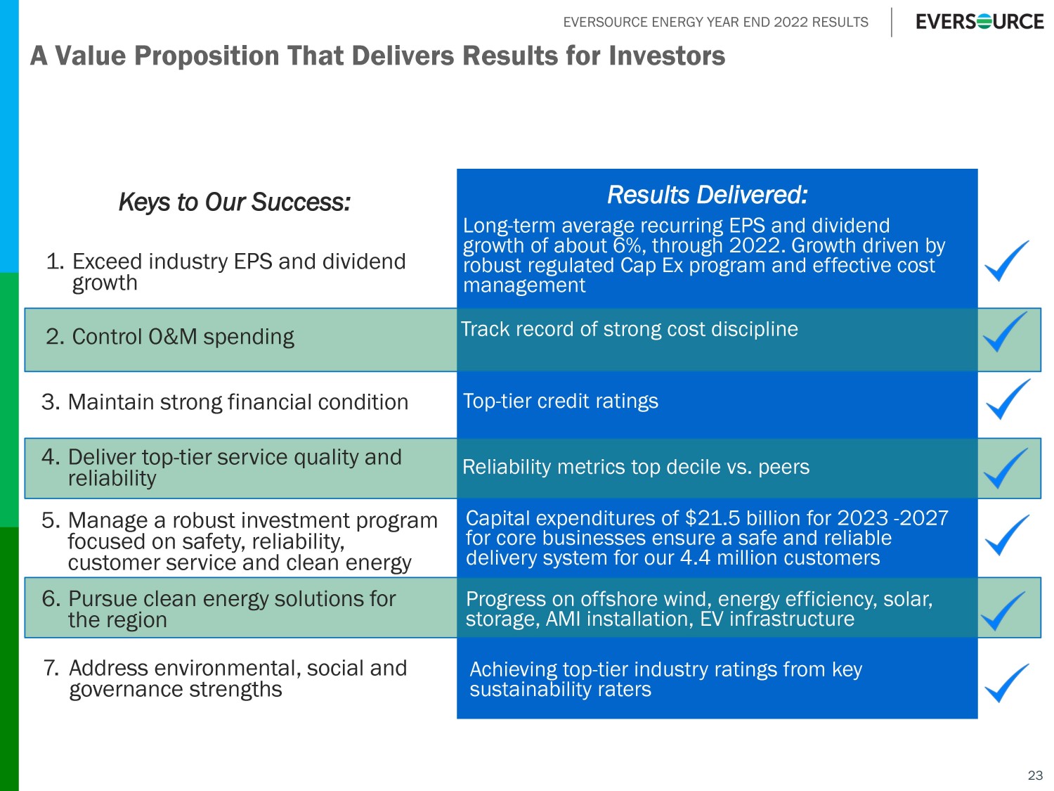 EVERSOURCE ENERGY YEAR END 2022 RESULTS 23 A Value Proposition That Delivers Results for Investors Keys to Our Success: Results Delivered: 2. Control O&M spending Track record of strong cost discipline 1. Exceed industry EPS and dividend growth Long - term average recurring EPS and dividend growth of about 6%, through 2022. Growth driven by robust regulated Cap Ex program and effective cost management 4. Deliver top - tier service quality and reliability Reliability metrics top decile vs. peers 5. Manage a robust investment program focused on safety, reliability, customer service and clean energy Capital expenditures of $21.5 billion for 2023 - 2027 for core businesses ensure a safe and reliable delivery system for our 4.4 million customers 3. Maintain strong financial condition Top - tier credit ratings 6. Pursue clean energy solutions for the region Progress on offshore wind, energy efficiency, solar, storage, AMI installation, EV infrastructure 7. Address environmental, social and governance strengths Achieving top - tier industry ratings from key sustainability raters