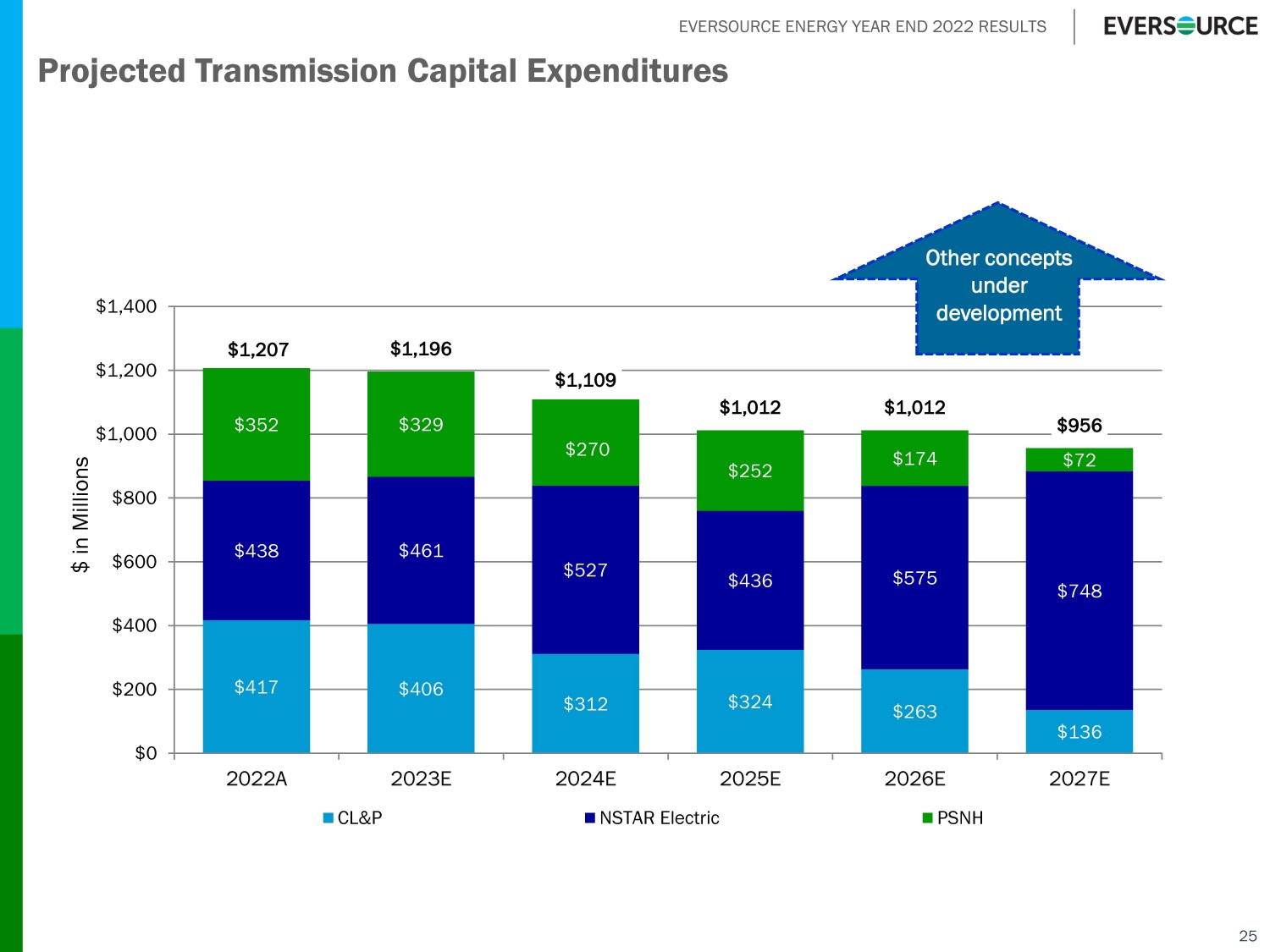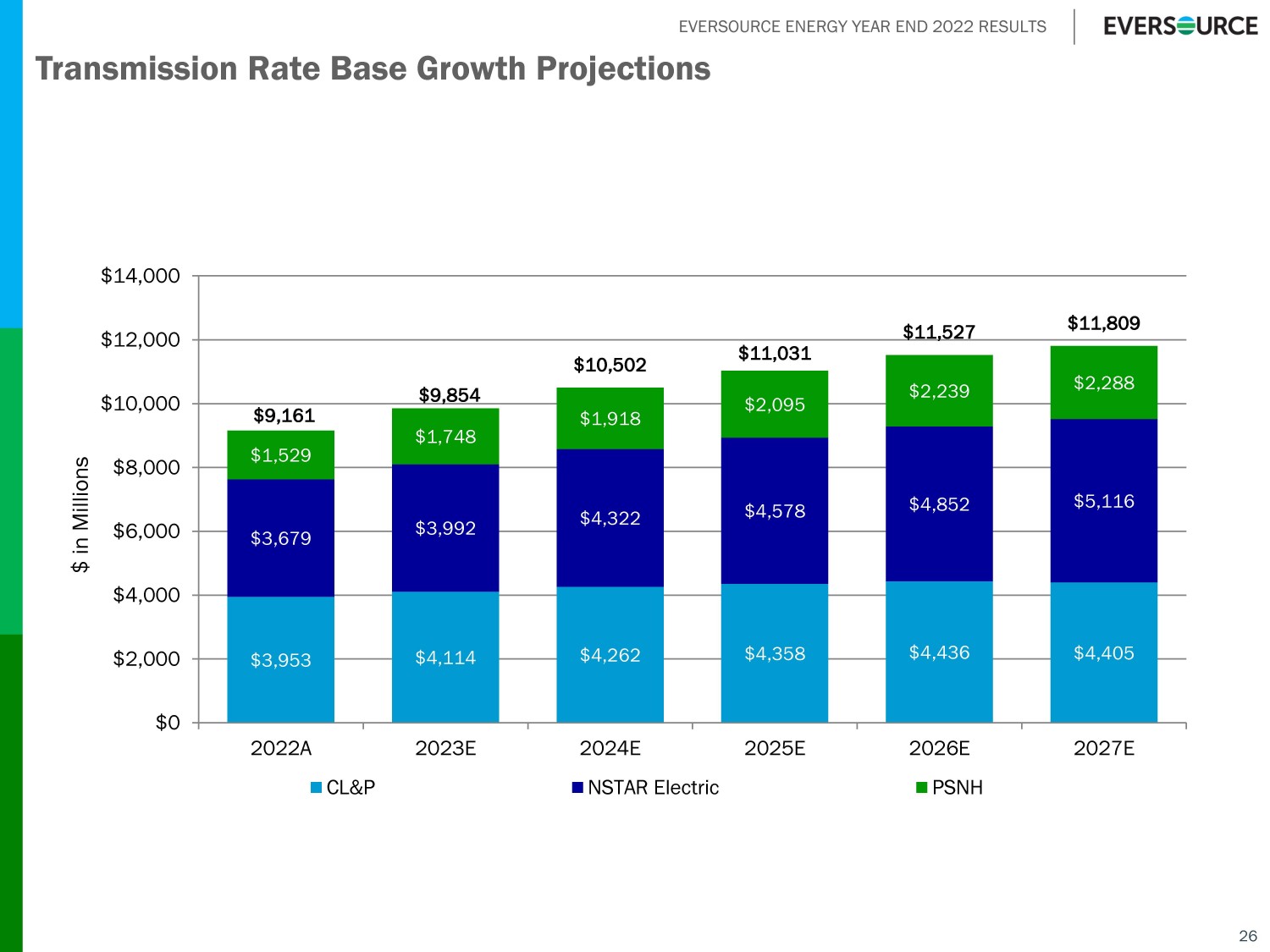EVERSOURCE ENERGY YEAR END 2022 RESULTS $417 $406 $312 $324 $263 $136 $438 $461 $527 $436 $575 $748 $352 $329 $270 $252 $174 $72 $1,207 $1,196 $1,109 $1,012 $1,012 $956 $0 $200 $400 $600 $800 $1,000 $1,200 $1,400 2022A 2023E 2024E 2025E 2026E 2027E CL&P NSTAR Electric PSNH 25 $ in Millions Projected Transmission Capital Expenditures Other concepts under development