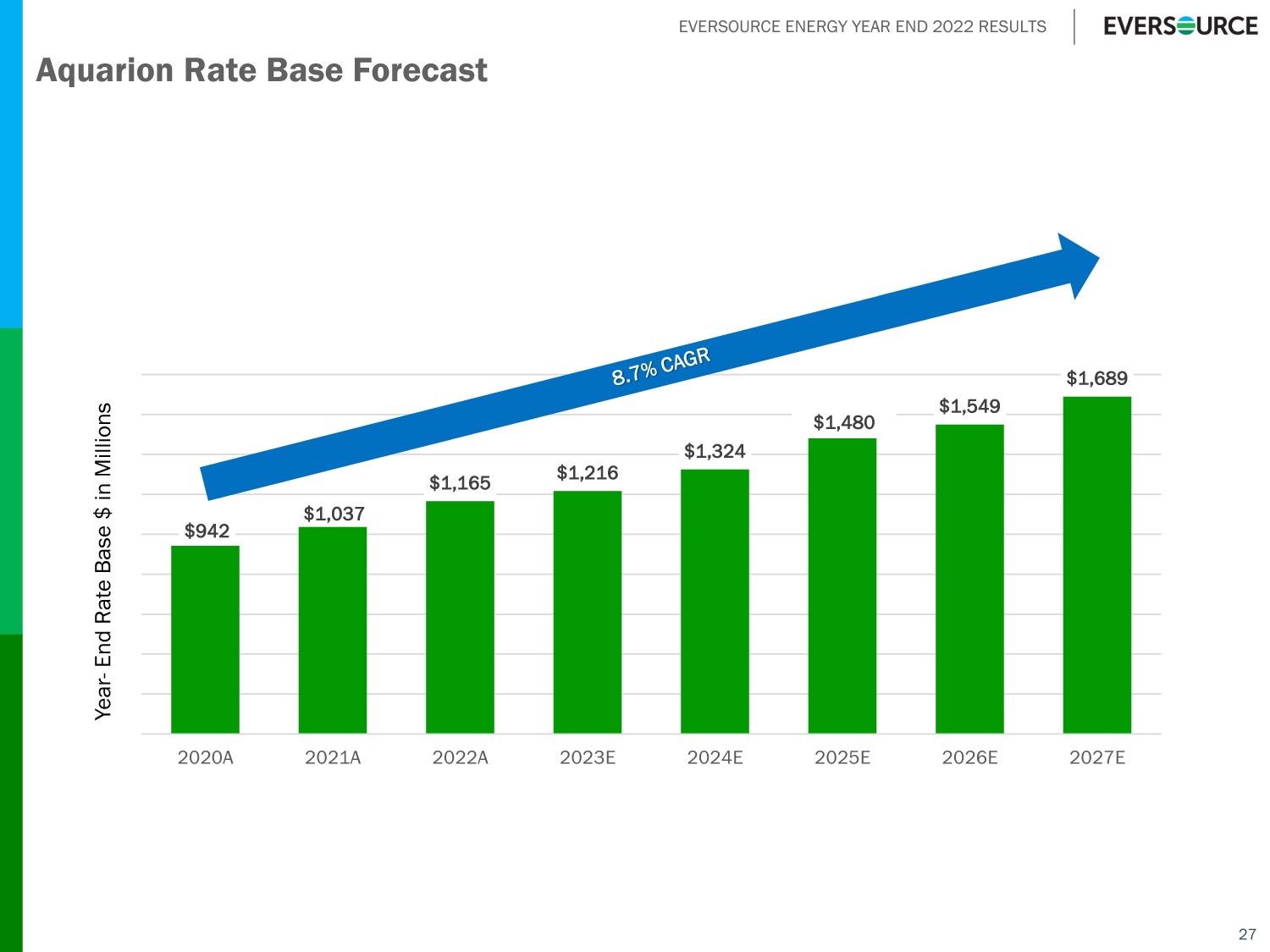 EVERSOURCE ENERGY YEAR END 2022 RESULTS $3,953 $4,114 $4,262 $4,358 $4,436 $4,405 $3,679 $3,992 $4,322 $4,578 $4,852 $5,116 $1,529 $1,748 $1,918 $2,095 $2,239 $2,288 $9,161 $9,854 $10,502 $11,031 $11,527 $11,809 $0 $2,000 $4,000 $6,000 $8,000 $10,000 $12,000 $14,000 2022A 2023E 2024E 2025E 2026E 2027E CL&P NSTAR Electric PSNH 26 $ in Millions Transmission Rate Base Growth Projections