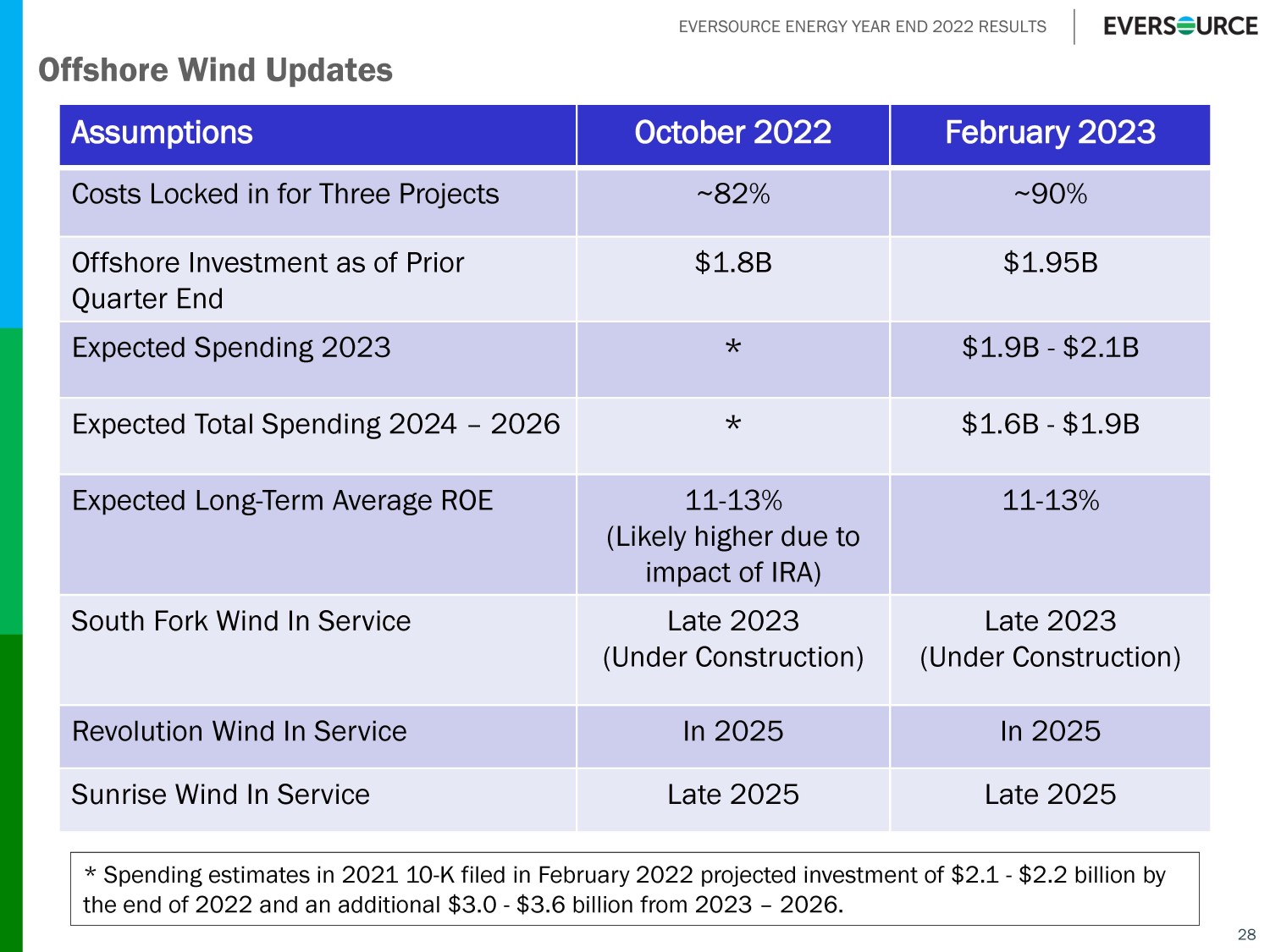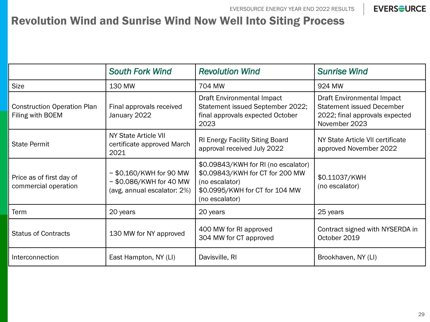 EVERSOURCE ENERGY YEAR END 2022 RESULTS 28 Assumptions October 2022 February 2023 Costs Locked in for Three Projects ~82% ~90% Offshore Investment as of Prior Quarter End $1.8B $1.95B Expected Spending 2023 * $1.9B - $2.1B Expected Total Spending 2024 – 2026 * $1.6B - $1.9B Expected Long - Term Average ROE 11 - 13% (Likely higher due to impact of IRA) 11 - 13% South Fork Wind In Service Late 2023 (Under Construction) Late 2023 (Under Construction) Revolution Wind In Service In 2025 In 2025 Sunrise Wind In Service Late 2025 Late 2025 Offshore Wind Updates * Spending estimates in 2021 10 - K filed in February 2022 projected investment of $2.1 - $2.2 billion by the end of 2022 and an additional $3.0 - $3.6 billion from 2023 – 2026.