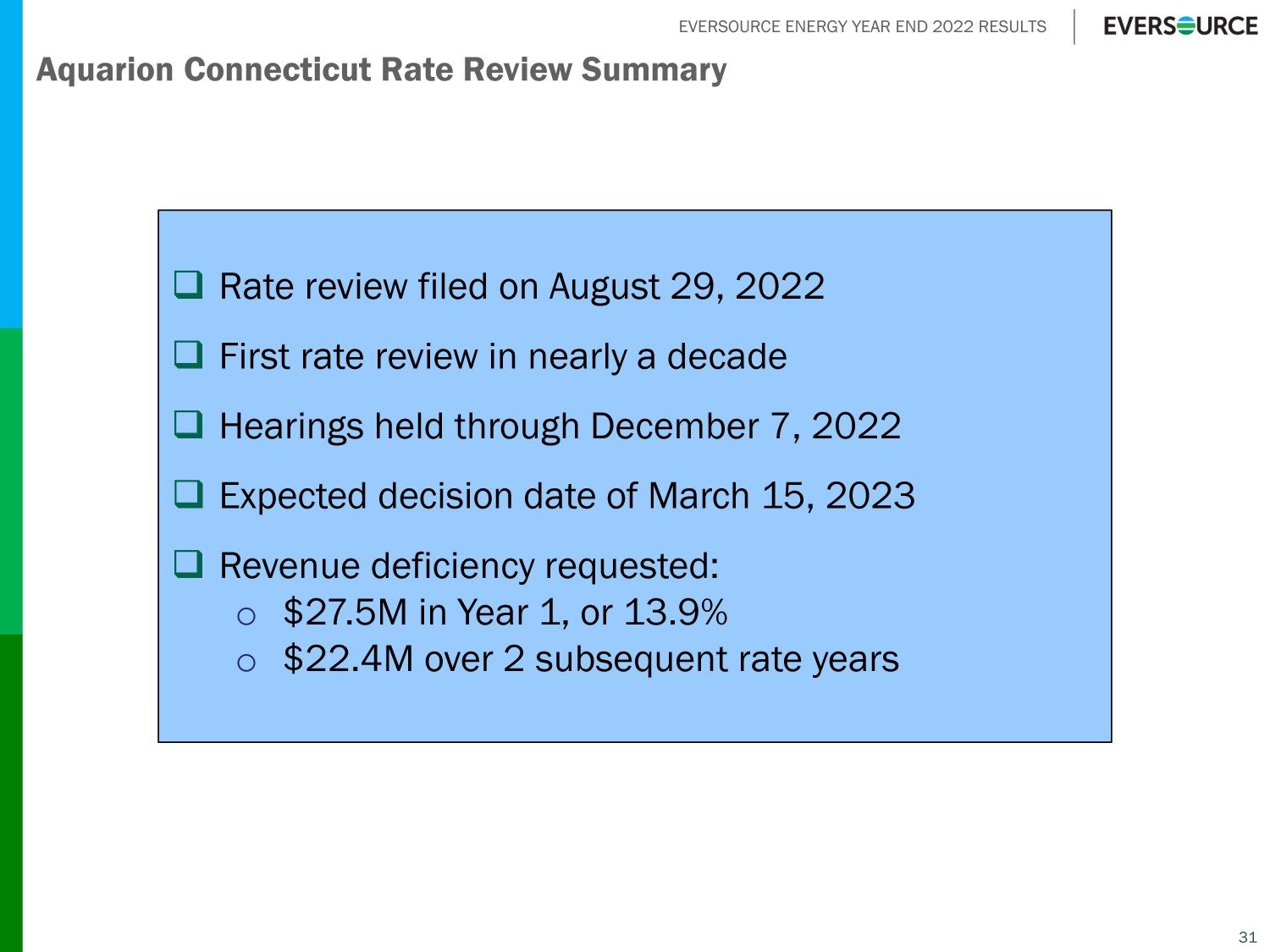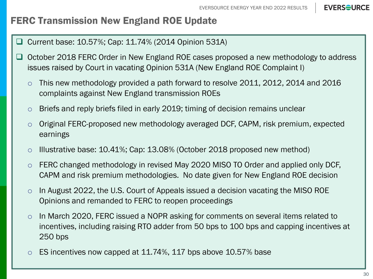 EVERSOURCE ENERGY YEAR END 2022 RESULTS 30 FERC Transmission New England ROE Update □ Current base: 10.57%; Cap: 11.74% (2014 Opinion 531A) □ October 2018 FERC Order in New England ROE cases proposed a new methodology to address issues raised by Court in vacating Opinion 531A (New England ROE Complaint I) o This new methodology provided a path forward to resolve 2011, 2012, 2014 and 2016 complaints against New England transmission ROEs o Briefs and reply briefs filed in early 2019; timing of decision remains unclear o Original FERC - proposed new methodology averaged DCF, CAPM, risk premium, expected earnings o Illustrative base: 10.41%; Cap: 13.08% (October 2018 proposed new method) o FERC changed methodology in revised May 2020 MISO TO Order and applied only DCF, CAPM and risk premium methodologies. No date given for New England ROE decision o In August 2022, the U.S. Court of Appeals issued a decision vacating the MISO ROE Opinions and remanded to FERC to reopen proceedings o In March 2020, FERC issued a NOPR asking for comments on several items related to incentives, including raising RTO adder from 50 bps to 100 bps and capping incentives at 250 bps o ES incentives now capped at 11.74%, 117 bps above 10.57% base