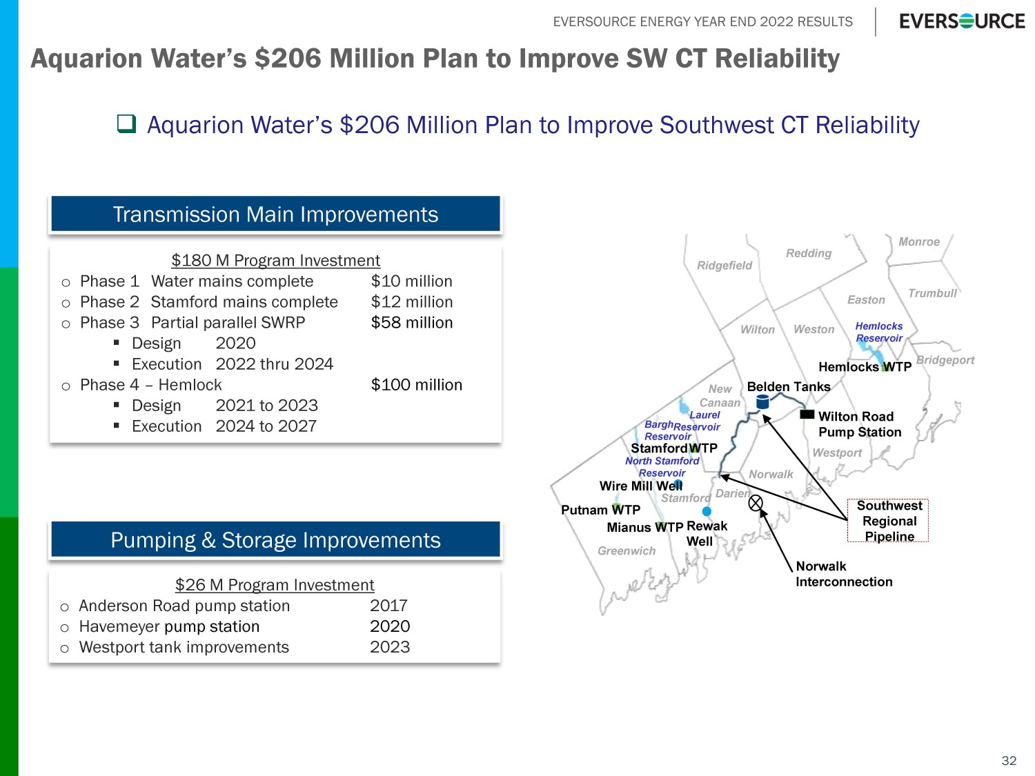 EVERSOURCE ENERGY YEAR END 2022 RESULTS Aquarion Connecticut Rate Review Summary □ Rate review filed on August 29, 2022 □ First rate review in nearly a decade □ Hearings held through December 7, 2022 □ Expected decision date of March 15, 2023 □ Revenue deficiency requested: o $27.5M in Year 1, or 13.9% o $22.4M over 2 subsequent rate years 31