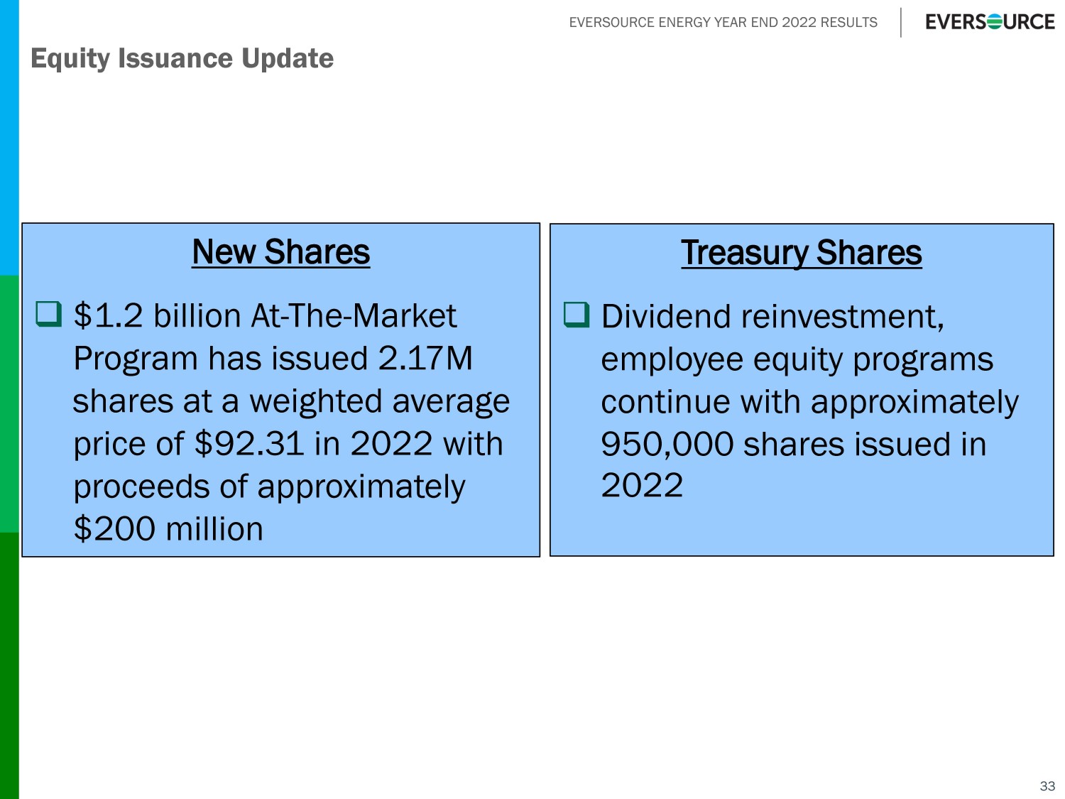 EVERSOURCE ENERGY YEAR END 2022 RESULTS Equity Issuance Update New Shares □ $1.2 billion At - The - Market Program has issued 2.17M shares at a weighted average price of $92.31 in 2022 with proceeds of approximately $200 million Treasury Shares □ Dividend reinvestment, employee equity programs continue with approximately 950,000 shares issued in 2022 33