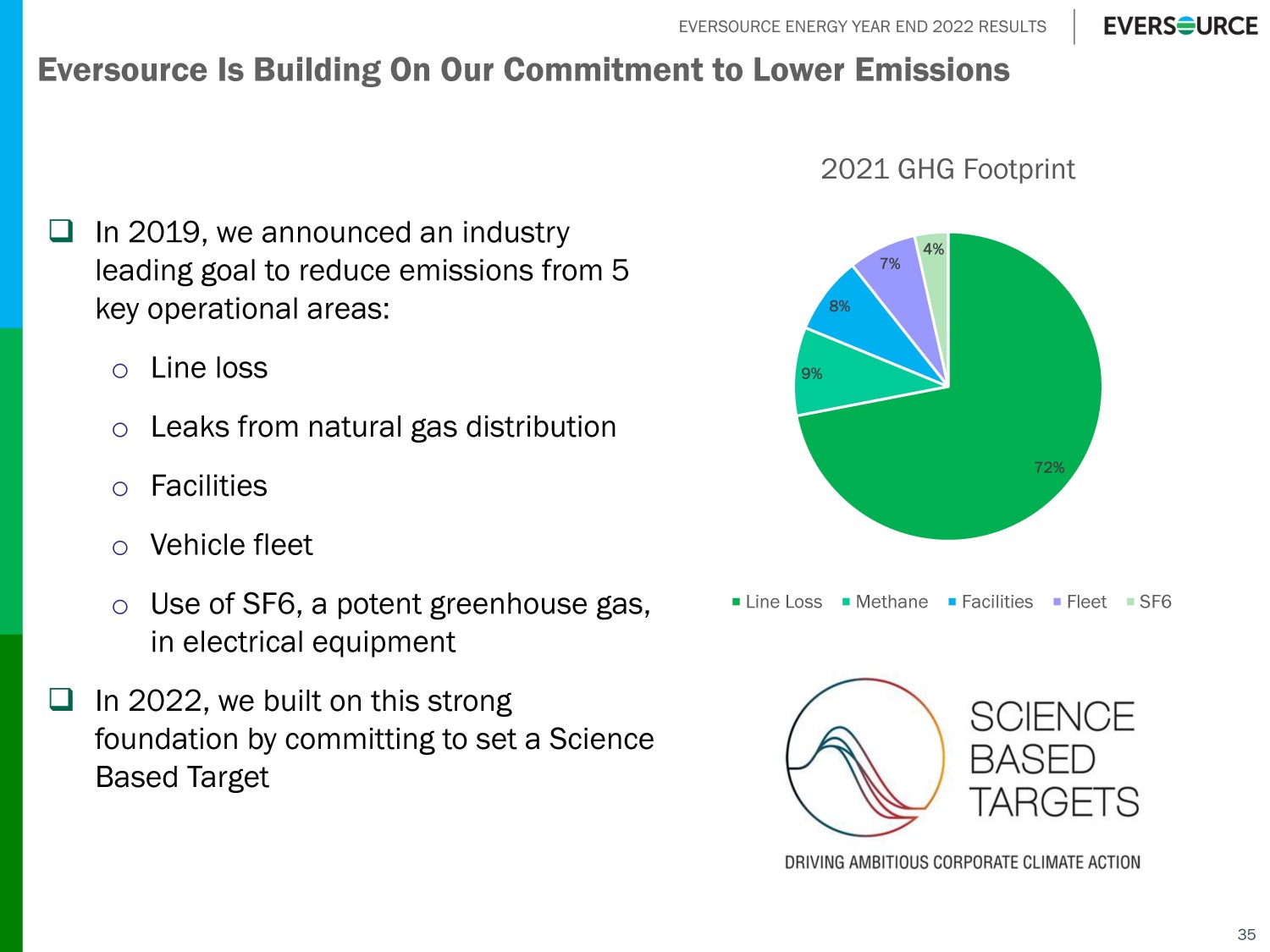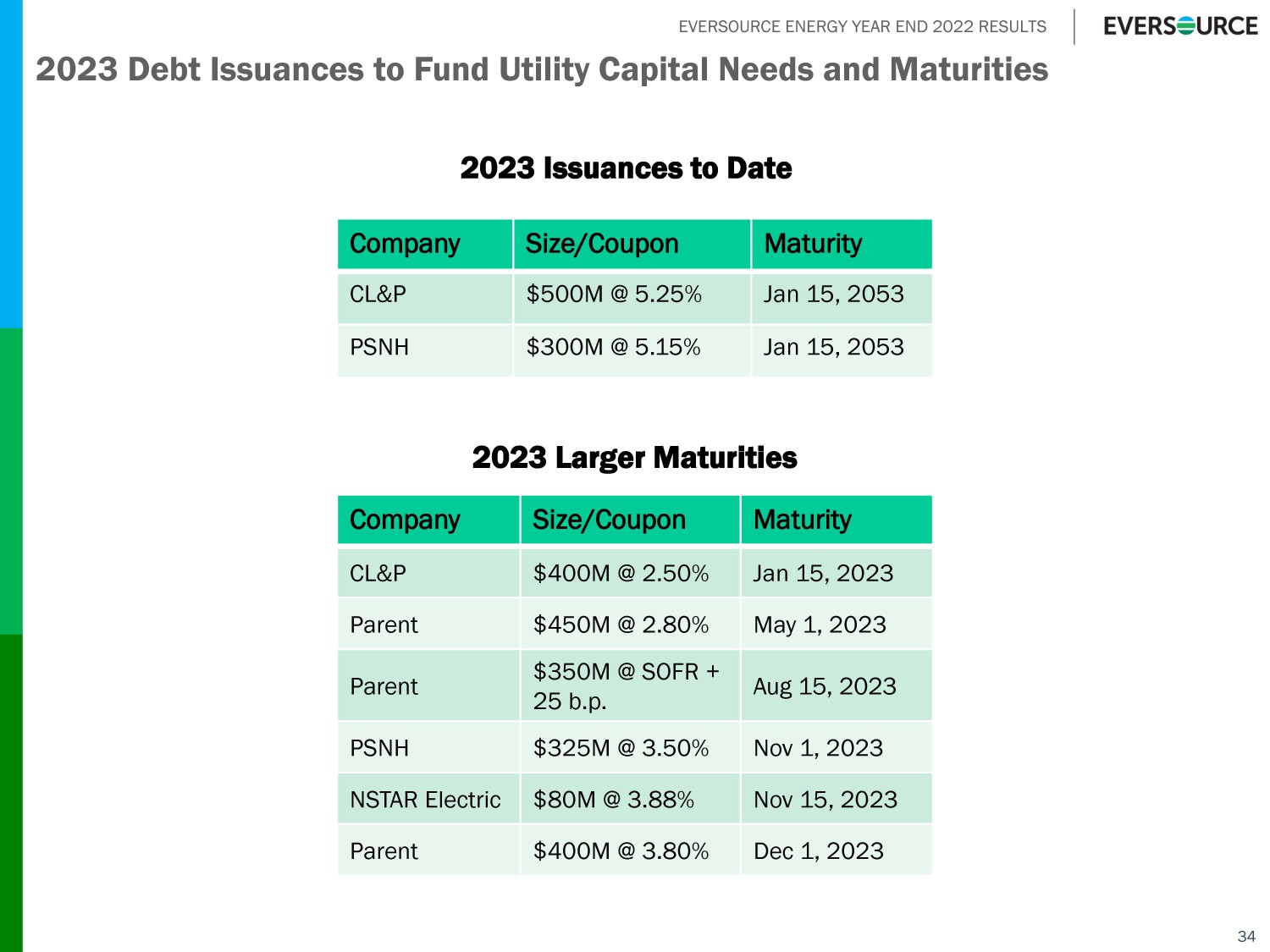 EVERSOURCE ENERGY YEAR END 2022 RESULTS Company Size/Coupon Maturity CL&P $400M @ 2.50% Jan 15, 2023 Parent $450M @ 2.80% May 1, 2023 Parent $350M @ SOFR + 25 b.p. Aug 15, 2023 PSNH $325M @ 3.50% Nov 1, 2023 NSTAR Electric $80M @ 3.88% Nov 15, 2023 Parent $400M @ 3.80% Dec 1, 2023 34 2023 Debt Issuances to Fund Utility Capital Needs and Maturities 2023 Issuances to Date 2023 Larger Maturities Company Size/Coupon Maturity CL&P $500M @ 5.25% Jan 15, 2053 PSNH $300M @ 5.15% Jan 15, 2053