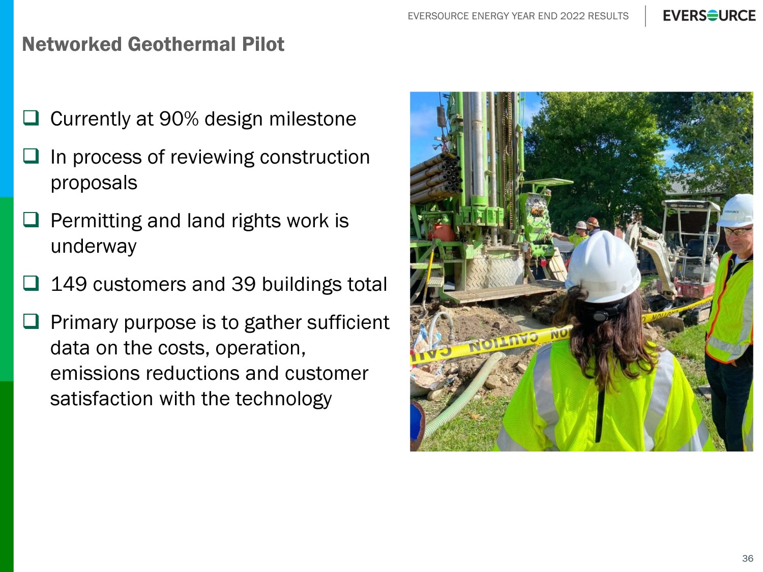 EVERSOURCE ENERGY YEAR END 2022 RESULTS □ Currently at 90% design milestone □ In process of reviewing construction proposals □ Permitting and land rights work is underway □ 149 customers and 39 buildings total □ Primary purpose is to gather sufficient data on the costs, operation, emissions reductions and customer satisfaction with the technology 36 Networked Geothermal Pilot