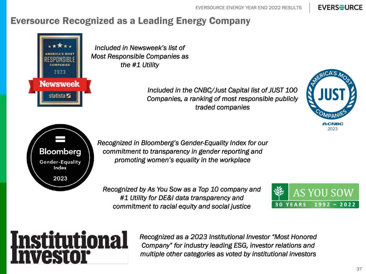 EVERSOURCE ENERGY YEAR END 2022 RESULTS Eversource Recognized as a Leading Energy Company 37 Included in Newsweek’s list of Most Responsible Companies as the #1 Utility Included in the CNBC/Just Capital list of JUST 100 Companies, a ranking of most responsible publicly traded companies Recognized in Bloomberg’s Gender - Equality Index for our commitment to transparency in gender reporting and promoting women’s equality in the workplace Recognized as a 2023 Institutional Investor “Most Honored Company” for industry leading ESG, investor relations and multiple other categories as voted by institutional investors Recognized by As You Sow as a Top 10 company and #1 Utility for DE&I data transparency and commitment to racial equity and social justice