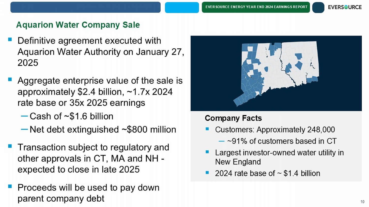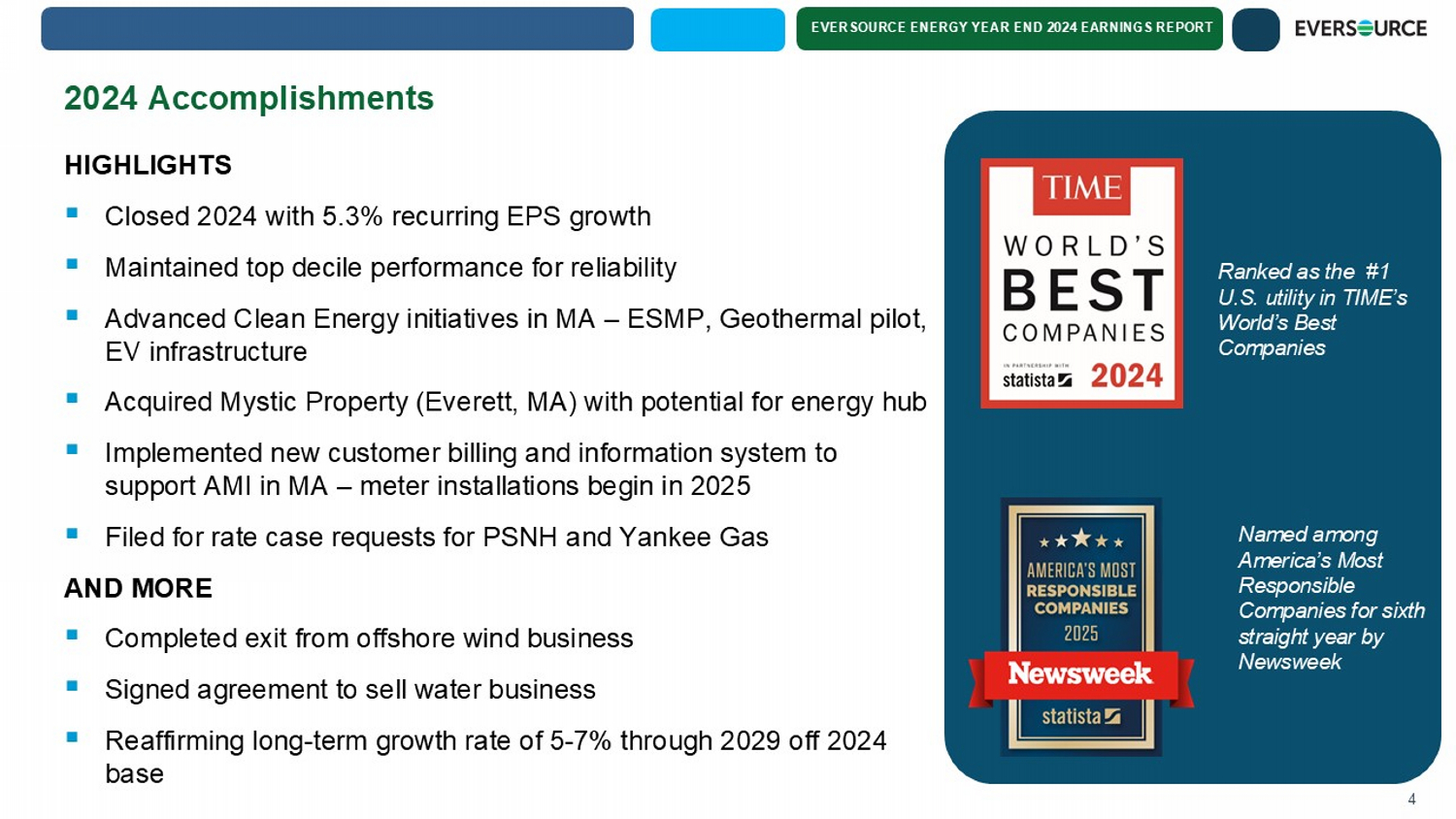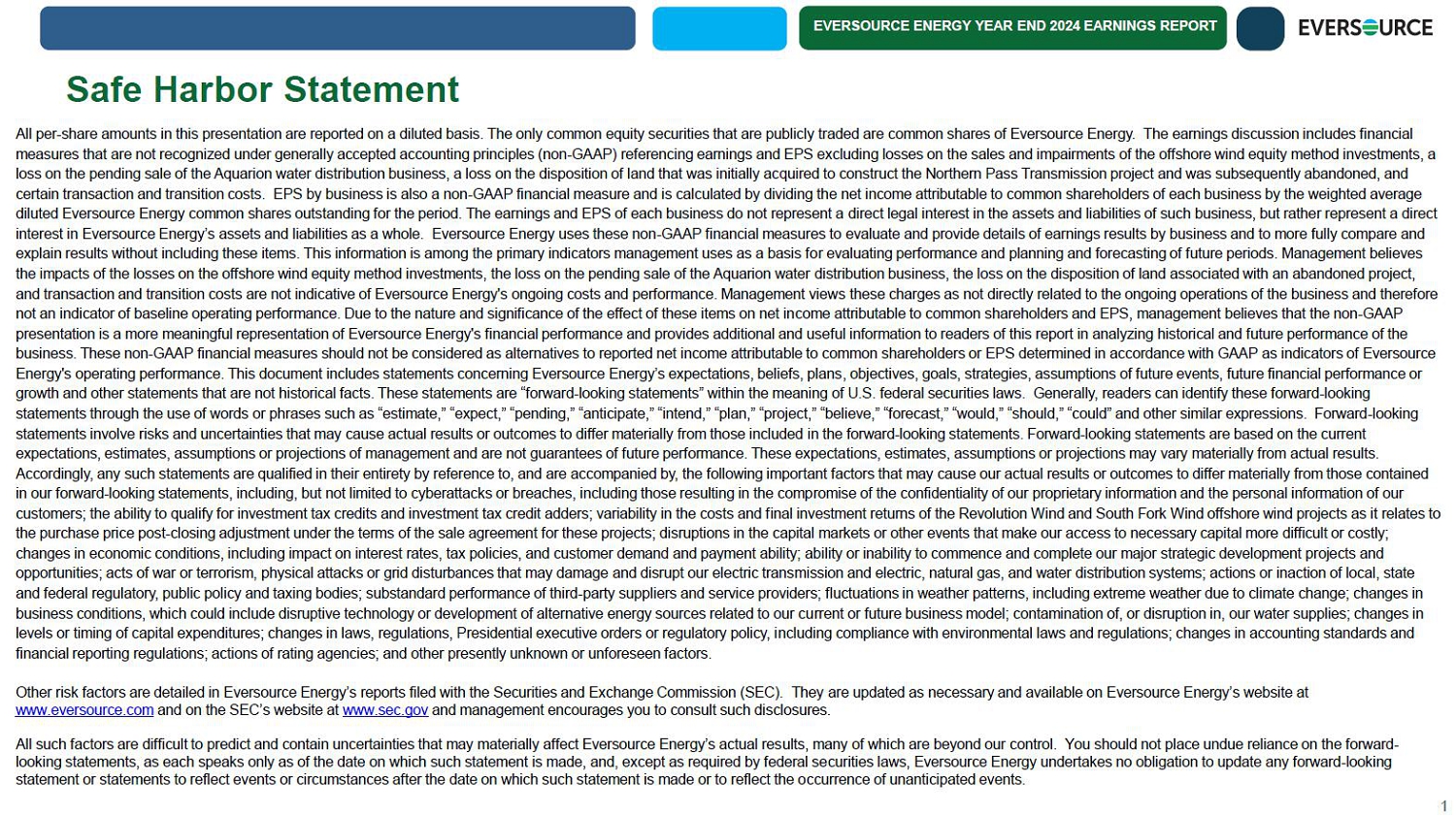 EVERSOURCE ENERGY YEAR END 2024 EARNINGS REPORT Safe Harbor Statement All per-share amounts in this presentation are reported on a diluted basis. The only common equity securities that are publicly traded are common shares of Eversource Energy. The earnings discussion includes financial measures that are not recognized under generally accepted accounting principles (non-GAAP) referencing earnings and EPS excluding losses on the sales and impairments of the offshore wind equity method investments, a loss on the pending sale of the Aquarion water distribution business, a loss on the disposition of land that was initially acquired to construct the Northern Pass Transmission project and was subsequently abandoned, and certain transaction and transition costs. EPS by business is also a non-GAAP financial measure and is calculated by dividing the net income attributable to common shareholders of each business by the weighted average diluted Eversource Energy common shares outstanding for the period. The earnings and EPS of each business do not represent a direct legal interest in the assets and liabilities of such business, but rather represent a direct interest in Eversource Energy's assets and liabilities as a whole. Eversource Energy uses these non-GAAP financial measures to evaluate and provide details of earnings results by business and to more fully compare and explain results without including these items. This information is among the primary indicators management uses as a basis for evaluating performance and planning and forecasting of future periods. Management believes the impacts of the losses on the offshore wind equity method investments, the loss on the pending sale of the Aquarion water distribution business, the loss on the disposition of land associated with an abandoned project, and transaction and transition costs are not indicative of Eversource Energy's ongoing costs and performance. Management views these charges as not directly related to the ongoing operations of the business and therefore not an indicator of baseline operating performance. Due to the nature and significance of the effect of these items on net income attributable to common shareholders and EPS, management believes that the non-GAAP presentation is a more meaningful representation of Eversource Energy's financial performance and provides additional and useful information to readers of this report in analyzing historical and future performance of the business. These non-GAAP financial measures should not be considered as alternatives to reported net income attributable to common shareholders or EPS determined in accordance with GAAP as indicators of Eversource Energy's operating performance. This document includes statements concerning Eversource Energy's expectations, beliefs, plans, objectives, goals, strategies, assumptions of future events, future financial performance or growth and other statements that are not historical facts. These statements are "forward-looking statements" within the meaning of U.S. federal securities laws. Generally, readers can identify these forward-looking statements through the use of words or phrases such as "estimate," "expect," "pending," "anticipate," "intend," "plan," "project," "believe," "forecast," "would," "should," "could" and other similar expressions. Forward-looking statements involve risks and uncertainties that may cause actual results or outcomes to differ materially from those included in the forward-looking statements. Forward-looking statements are based on the current expectations, estimates, assumptions or projections of management and are not guarantees of future performance. These expectations, estimates, assumptions or projections may vary materially from actual results. Accordingly, any such statements are qualified in their entirety by reference to, and are accompanied by, the following important factors that may cause our actual results or outcomes to differ materially from those contained in our forward-looking statements, including, but not limited to cyberattacks or breaches, including those resulting in the compromise of the confidentiality of our proprietary information and the personal information of our customers; the ability to qualify for investment tax credits and investment tax credit adders; variability in the costs and final investment returns of the Revolution Wind and South Fork Wind offshore wind projects as it relates to the purchase price post-closing adjustment under the terms of the sale agreement for these projects; disruptions in the capital markets or other events that make our access to necessary capital more difficult or costly; changes in economic conditions, including impact on interest rates, tax policies, and customer demand and payment ability; ability or inability to commence and complete our major strategic development projects and opportunities; acts of war or terrorism, physical attacks or grid disturbances that may damage and disrupt our electric transmission and electric, natural gas, and water distribution systems; actions or inaction of local, state and federal regulatory, public policy and taxing bodies; substandard performance of third-party suppliers and service providers; fluctuations in weather patterns, including extreme weather due to climate change; changes in business conditions, which could include disruptive technology or development of alternative energy sources related to our current or future business model; contamination of, or disruption in, our water supplies; changes in levels or timing of capital expenditures; changes in laws, regulations, Presidential executive orders or regulatory policy, including compliance with environmental laws and regulations; changes in accounting standards and financial reporting regulations; actions of rating agencies; and other presently unknown or unforeseen factors. Other risk factors are detailed in Eversource Energy's reports filed with the Securities and E