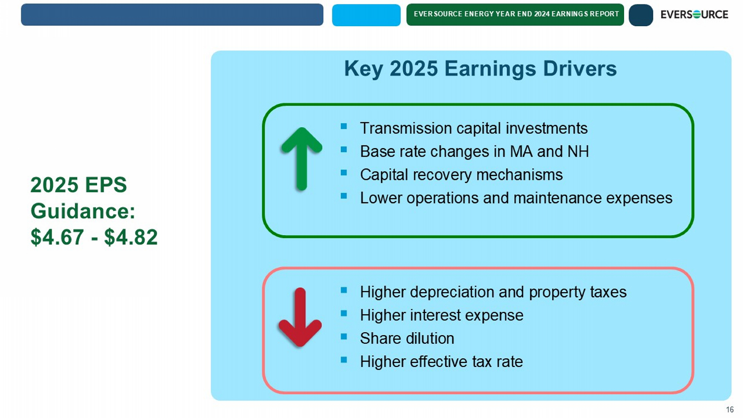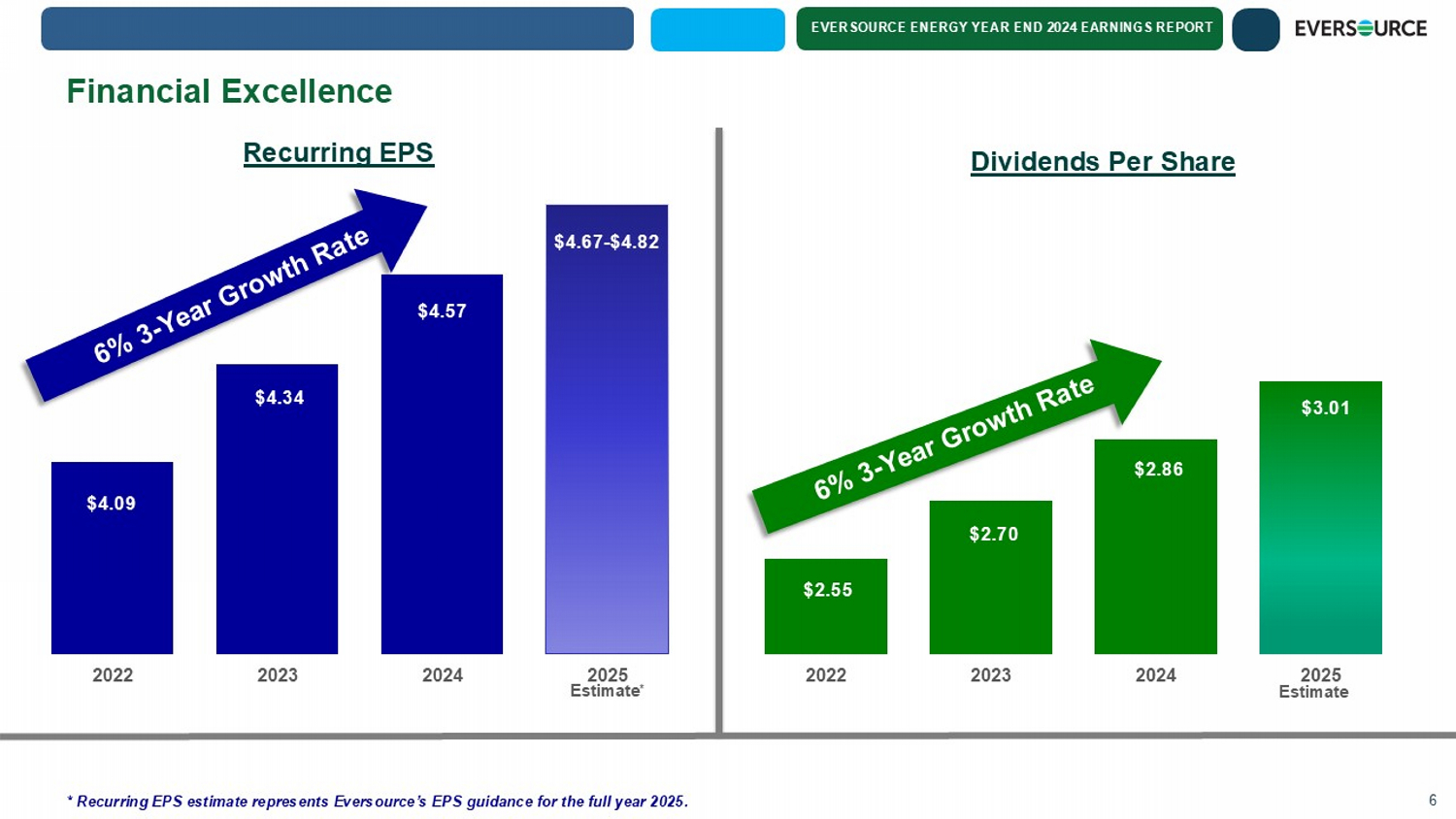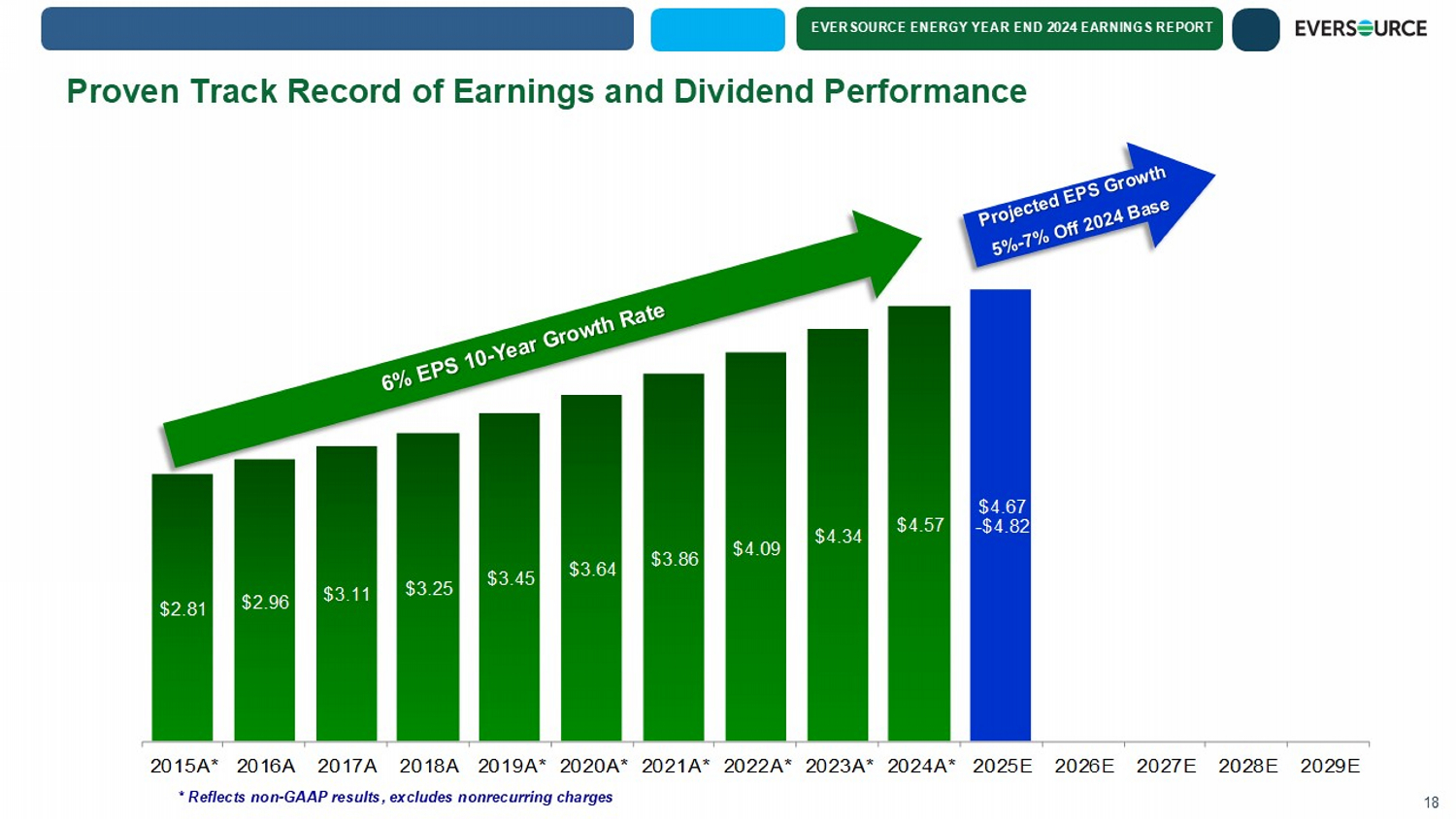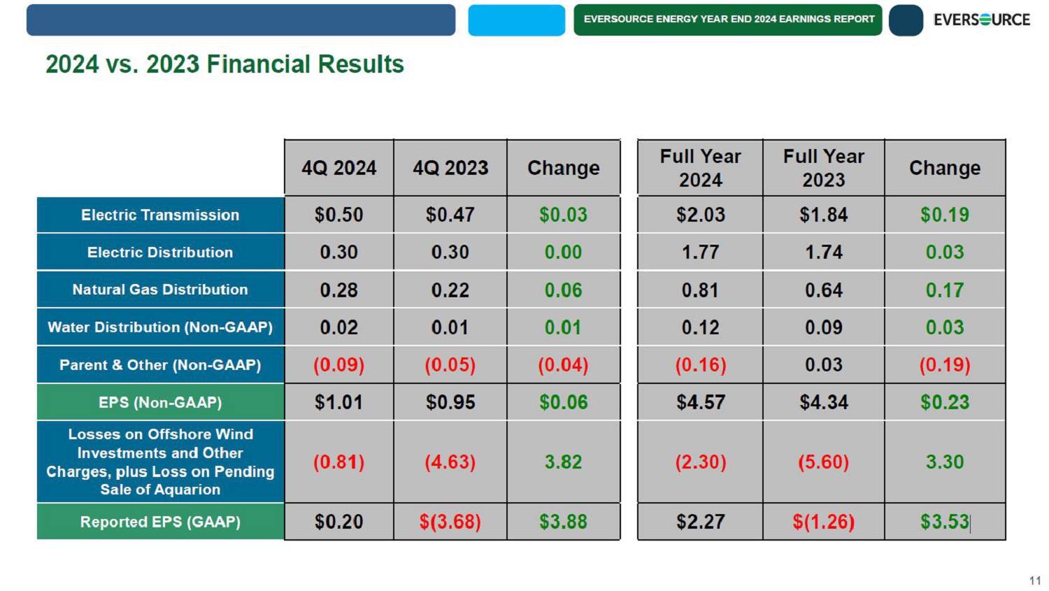 EVERSOURCE ENERGY YEAR END 2024 EARNINGS REPORT Safe Harbor Statement All per-share amounts in this presentation are reported on a diluted basis. The only common equity securities that are publicly traded are common shares of Eversource Energy. The earnings discussion includes financial measures that are not recognized under generally accepted accounting principles (non-GAAP) referencing earnings and EPS excluding losses on the sales and impairments of the offshore wind equity method investments, a loss on the pending sale of the Aquarion water distribution business, a loss on the disposition of land that was initially acquired to construct the Northern Pass Transmission project and was subsequently abandoned, and certain transaction and transition costs. EPS by business is also a non-GAAP financial measure and is calculated by dividing the net income attributable to common shareholders of each business by the weighted average diluted Eversource Energy common shares outstanding for the period. The earnings and EPS of each business do not represent a direct legal interest in the assets and liabilities of such business, but rather represent a direct interest in Eversource Energy's assets and liabilities as a whole. Eversource Energy uses these non-GAAP financial measures to evaluate and provide details of earnings results by business and to more fully compare and explain results without including these items. This information is among the primary indicators management uses as a basis for evaluating performance and planning and forecasting of future periods. Management believes the impacts of the losses on the offshore wind equity method investments, the loss on the pending sale of the Aquarion water distribution business, the loss on the disposition of land associated with an abandoned project, and transaction and transition costs are not indicative of Eversource Energy's ongoing costs and performance. Management views these charges as not directly related to the ongoing operations of the business and therefore not an indicator of baseline operating performance. Due to the nature and significance of the effect of these items on net income attributable to common shareholders and EPS, management believes that the non-GAAP presentation is a more meaningful representation of Eversource Energy's financial performance and provides additional and useful information to readers of this report in analyzing historical and future performance of the business. These non-GAAP financial measures should not be considered as alternatives to reported net income attributable to common shareholders or EPS determined in accordance with GAAP as indicators of Eversource Energy's operating performance. This document includes statements concerning Eversource Energy's expectations, beliefs, plans, objectives, goals, strategies, assumptions of future events, future financial performance or growth and other statements that are not historical facts. These statements are "forward-looking statements" within the meaning of U.S. federal securities laws. Generally, readers can identify these forward-looking statements through the use of words or phrases such as "estimate," "expect," "pending," "anticipate," "intend," "plan," "project," "believe," "forecast," "would," "should," "could" and other similar expressions. Forward-looking statements involve risks and uncertainties that may cause actual results or outcomes to differ materially from those included in the forward-looking statements. Forward-looking statements are based on the current expectations, estimates, assumptions or projections of management and are not guarantees of future performance. These expectations, estimates, assumptions or projections may vary materially from actual results. Accordingly, any such statements are qualified in their entirety by reference to, and are accompanied by, the following important factors that may cause our actual results or outcomes to differ materially from those contained in our forward-looking statements, including, but not limited to cyberattacks or breaches, including those resulting in the compromise of the confidentiality of our proprietary information and the personal information of our customers; the ability to qualify for investment tax credits and investment tax credit adders; variability in the costs and final investment returns of the Revolution Wind and South Fork Wind offshore wind projects as it relates to the purchase price post-closing adjustment under the terms of the sale agreement for these projects; disruptions in the capital markets or other events that make our access to necessary capital more difficult or costly; changes in economic conditions, including impact on interest rates, tax policies, and customer demand and payment ability; ability or inability to commence and complete our major strategic development projects and opportunities; acts of war or terrorism, physical attacks or grid disturbances that may damage and disrupt our electric transmission and electric, natural gas, and water distribution systems; actions or inaction of local, state and federal regulatory, public policy and taxing bodies; substandard performance of third-party suppliers and service providers; fluctuations in weather patterns, including extreme weather due to climate change; changes in business conditions, which could include disruptive technology or development of alternative energy sources related to our current or future business model; contamination of, or disruption in, our water supplies; changes in levels or timing of capital expenditures; changes in laws, regulations, Presidential executive orders or regulatory policy, including compliance with environmental laws and regulations; changes in accounting standards and financial reporting regulations; actions of rating agencies; and other presently unknown or unforeseen factors. Other risk factors are detailed in Eversource Energy's reports filed with the Securities and E
